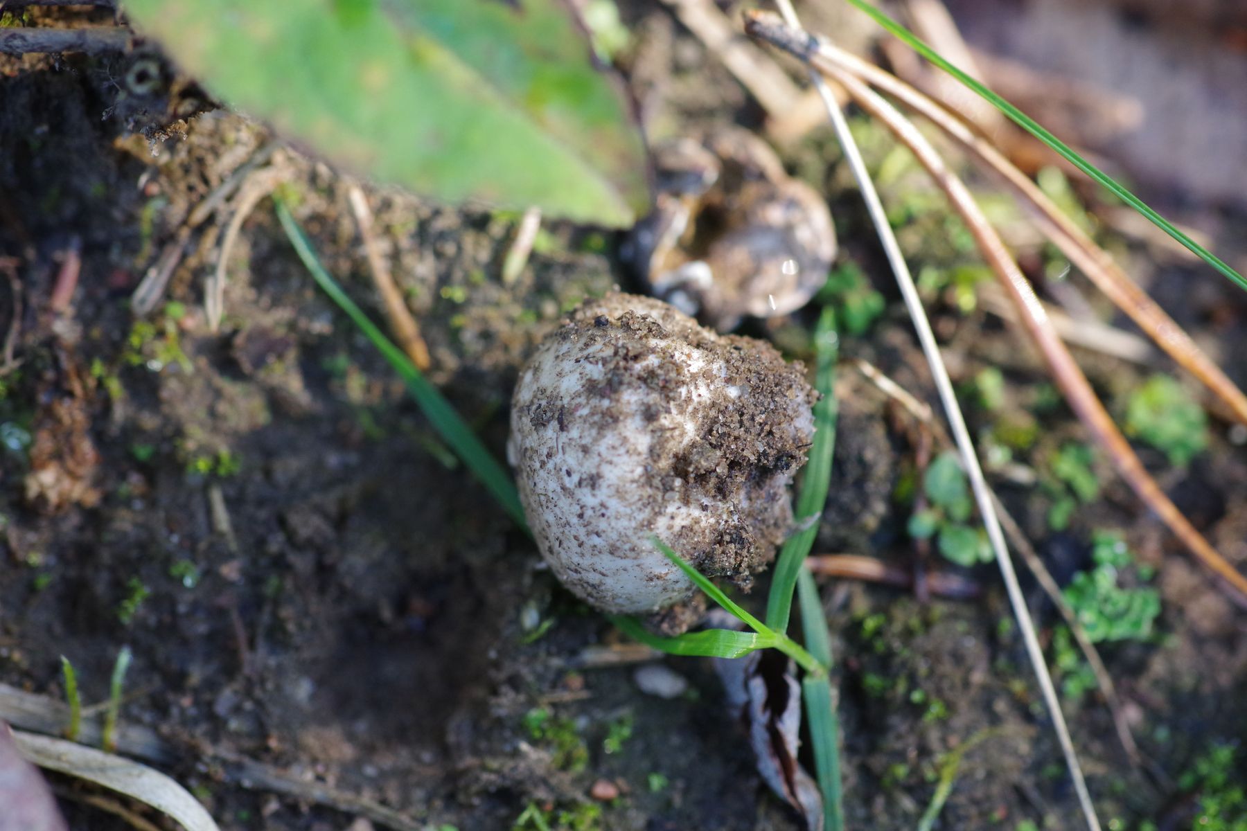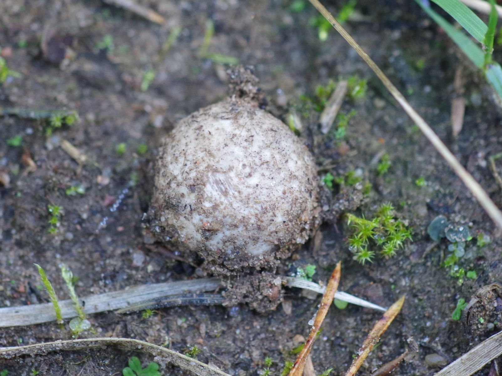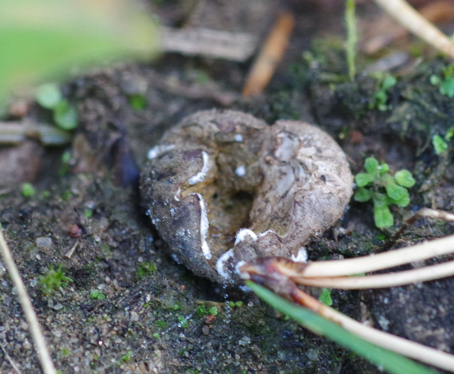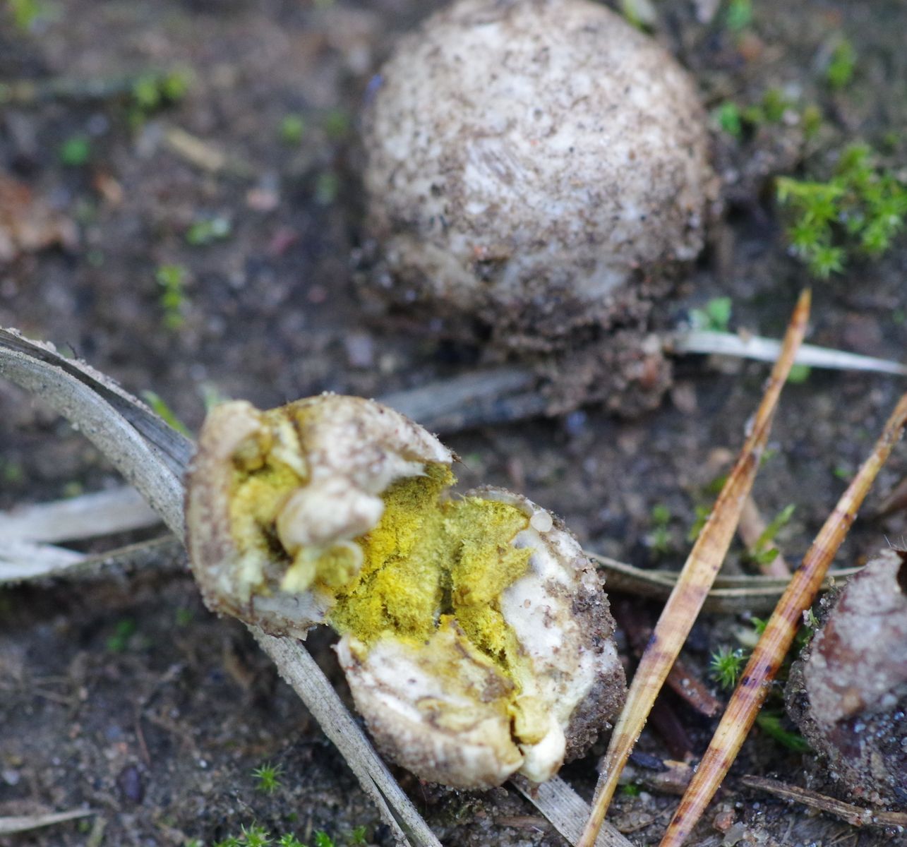 im Pionierwald, auf sandigem Ameisenhaufen, habe ich heute diesen Stäubling gefunden, der schon vom äußeren Erscheinungsbild her komisch aussieht. Um die 1 cm groß. 3 Stück, wovon einer noch heil ist und hoffentlich reif wird, ein lädierter und einer der von irgendwelchem Viehzeug rausgerissen und aufgerissen war und mein Interesse erweckte, weil das Innere deutlich gelb war. den habe ich eingesteckt. Es sieht aus, als wäre der weiße Teil eine Subgleba, so wie der Pilz zermurkelt ist, glaube ich nicht, dass man da noch einen sinnvollen Schnitte hinbekommt.