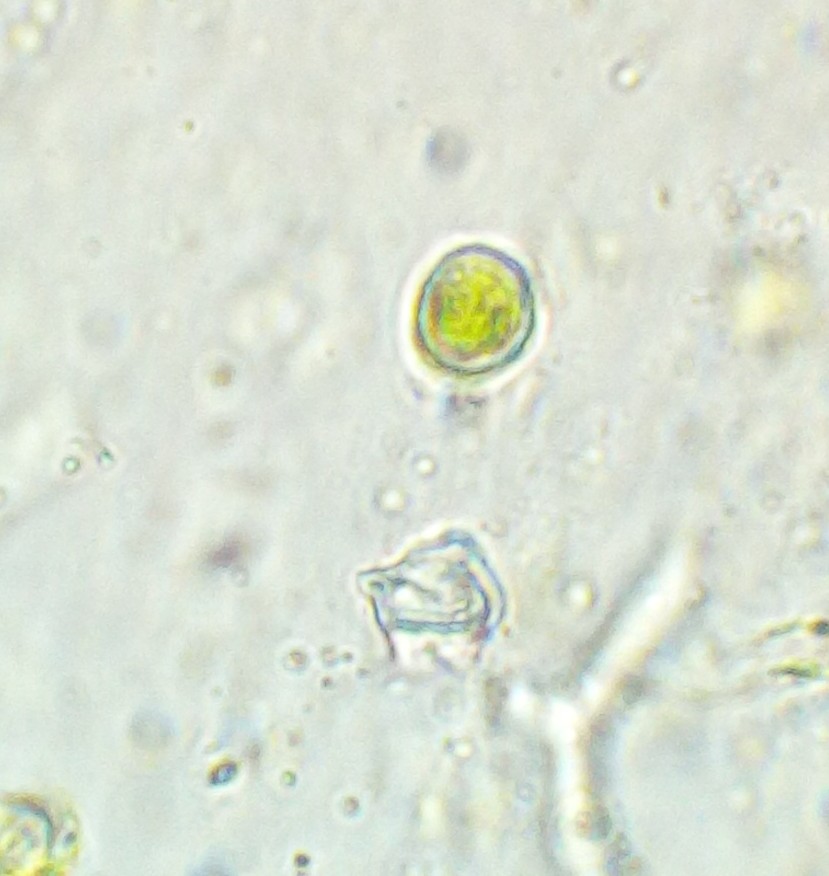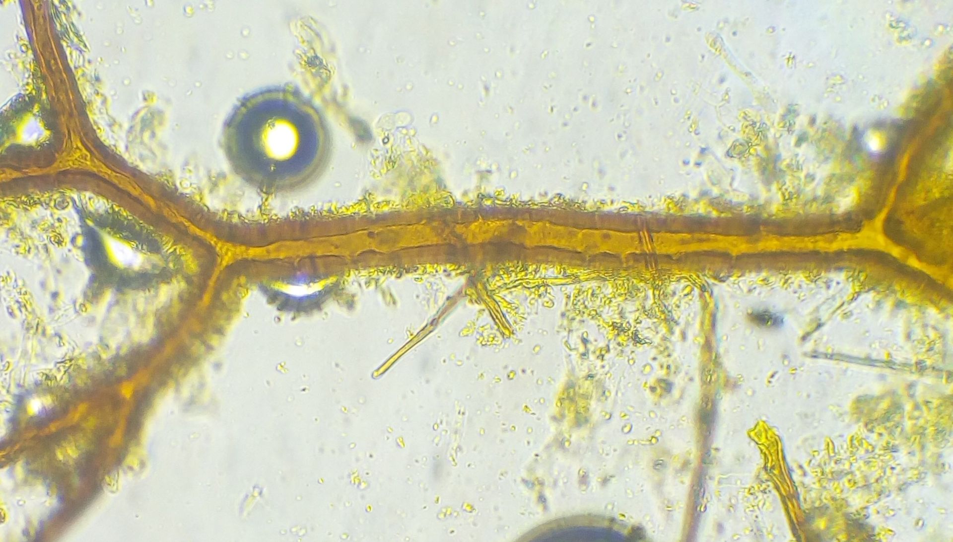 Unterm Mikroskop (alles in Wasser) sieht man vielfache Verzweigungen in Hierarchien. Die dicksten Hyphen sind 10-15 (gelegentlich fast bis 20) µm dick, eher gelbbraun, dickwandig, die dünneren sind knallgelb. Septen und Poren sehe ich eher nicht. Daneben gibt es noch transparente, dünnwandige, farblose, auch verzweigte Hyphen, die dann teils mit Septen. Sporen sind leider noch nicht zu sehen, auch nichts, was mal Spore werden will.
