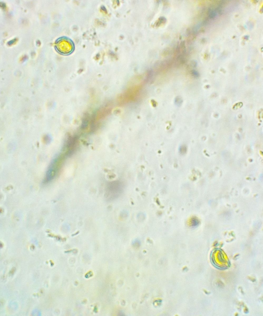 Unterm Mikroskop (alles in Wasser) sieht man vielfache Verzweigungen in Hierarchien. Die dicksten Hyphen sind 10-15 (gelegentlich fast bis 20) µm dick, eher gelbbraun, dickwandig, die dünneren sind knallgelb. Septen und Poren sehe ich eher nicht. Daneben gibt es noch transparente, dünnwandige, farblose, auch verzweigte Hyphen, die dann teils mit Septen. Sporen sind leider noch nicht zu sehen, auch nichts, was mal Spore werden will.