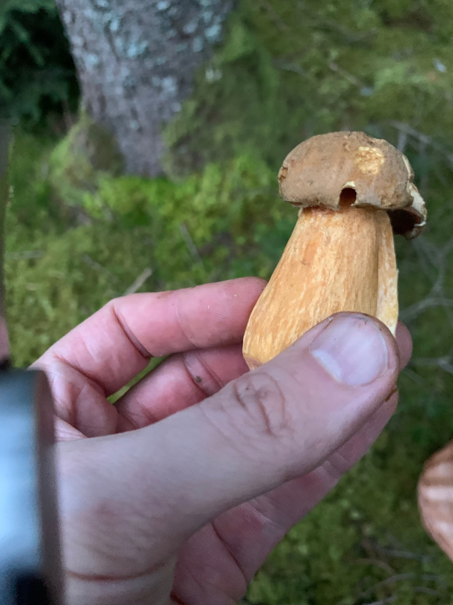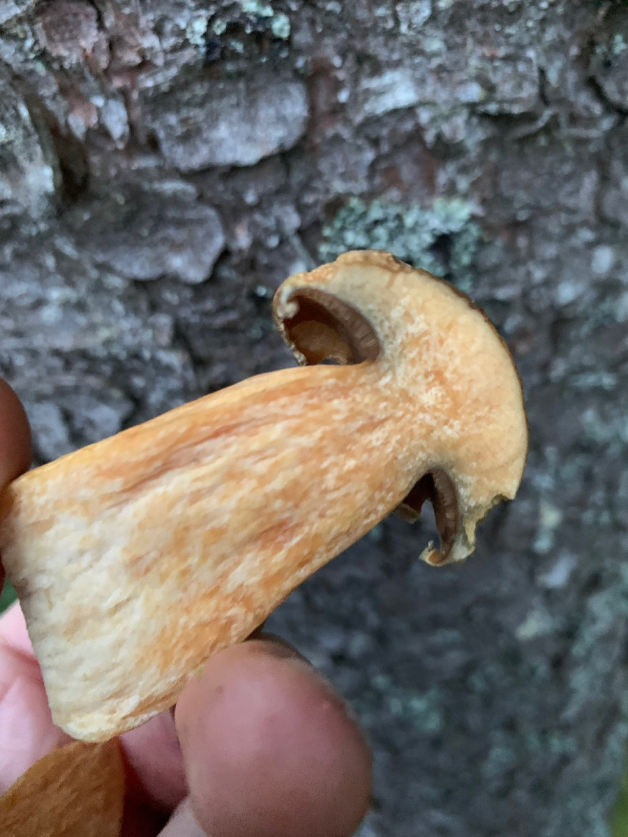 dieser Pilz sieht einem Steinpilz ähnlich fällt aber eher hell aus. Könnte sonst auch einer Hexe ähnlich sehen, aber fällt recht gelb aus, hat aber keine Blaufärbung bei Verletzung, was der Gelbfußröhrling z.B. haben sollte.