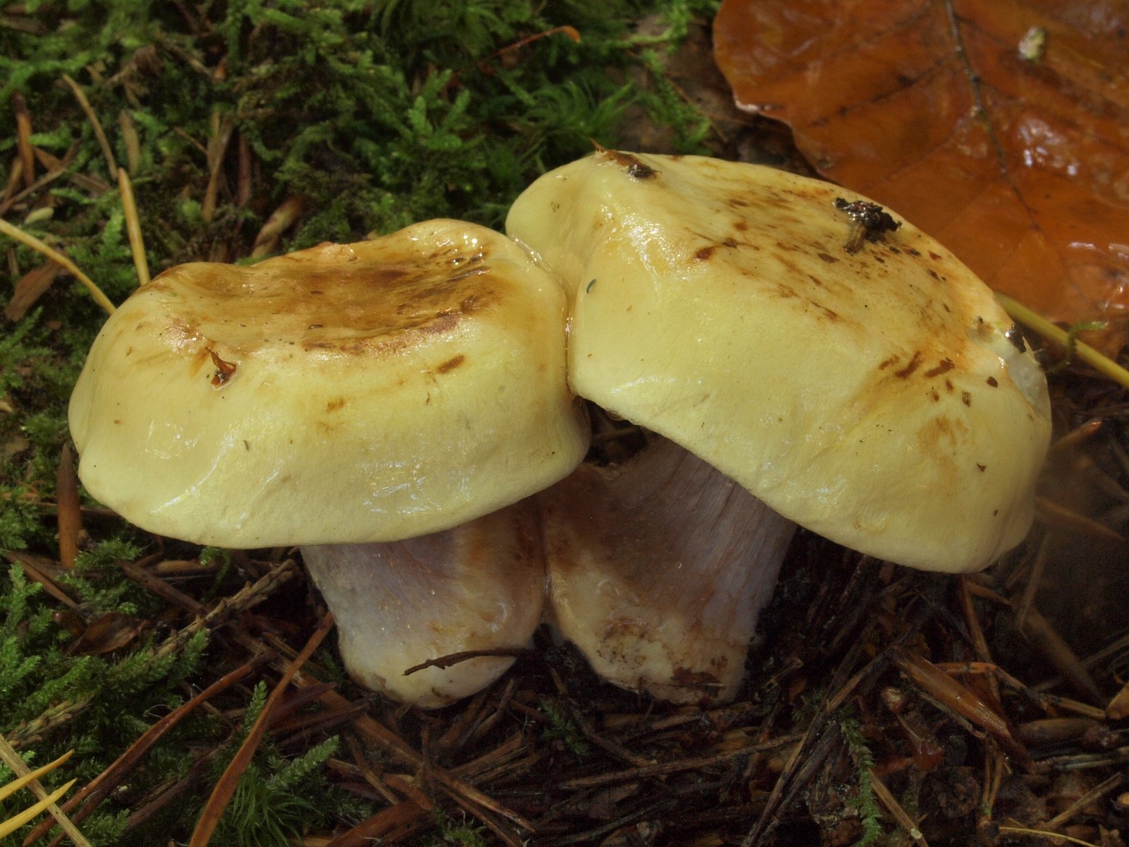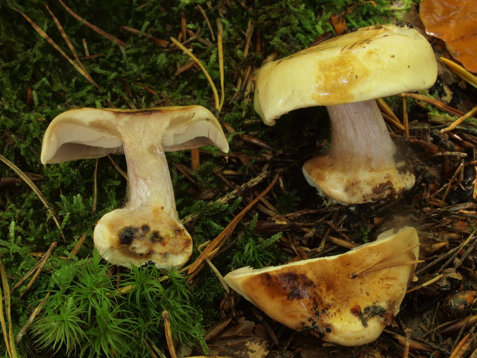 Noch eine Art vom gleichen Standort, die ich bisher nie gesehen habe. Hellgelber Hut, deutlich violette Stiele KOH-Reaktion negativ (Bild 2), wird noch von Rainer untersucht.Cortinarius sp.
