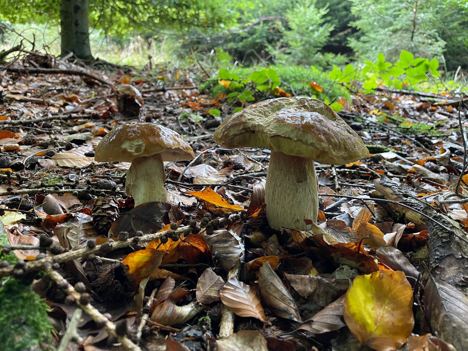 Hier und da gibt es in den Habitaten auch Fichtensteinpilze. Zusammen mit einer guten Maronen-Stelle hat sich so der Korb nochmal ansehnlich gefüllt.
