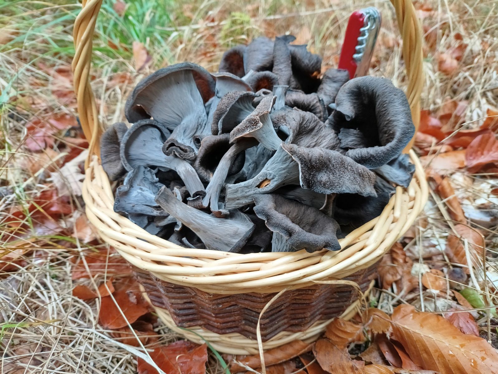 Auf dem Weg zu meiner besten Stelle für Mönchsköpfe habe ich nicht schlecht gestaunt. Eine weitere neue Herbsttrompeten-Stelle hat sich finden lassen. Ziemlich nah am Wegesrand. Das mir das bisher nicht aufgefallen ist...