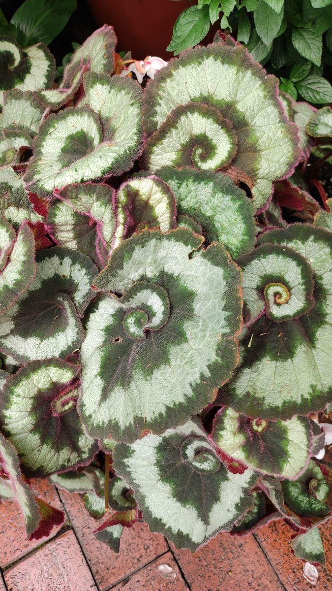 Gesehen im Neuen Botanischen Garten Marburg. Es handelt sich meines Wissens um eine Zuchtform der Königsbegonie, Begonia rex "Escargot". Ich finde sie einfach toll und fotografiere sie jedesmal, wenn ich dort bin.