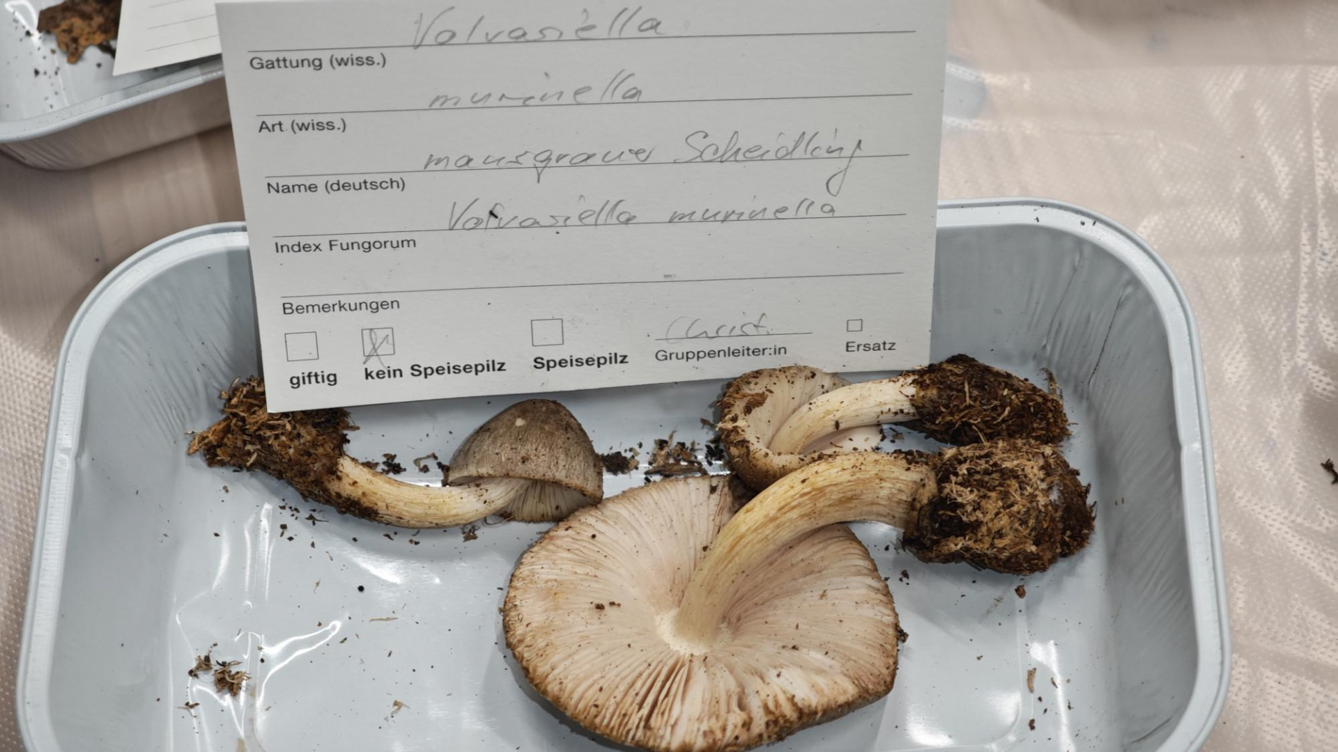 Zum Schluss werden noch die tödlich giftigen Pilzarten mit Namen genannt und auf dem Kontrollschein erfasst. Das war hier der der Kegelhütige Knollenblätterpilz. Die tödlich giftigen Pilzarten sind auf dem Kontrollschein mit Artnamen aufgeführt und müssen an der entsprechenden Stelle erfasst werden. Falls es noch giftige Pilze, die nicht auf dem Kontrollschein aufgeführt sind, im Korb hat, muss man diese selbst unter «Giftige Pilzarten» dazuschreiben. Das war hier aber nicht der Fall.
