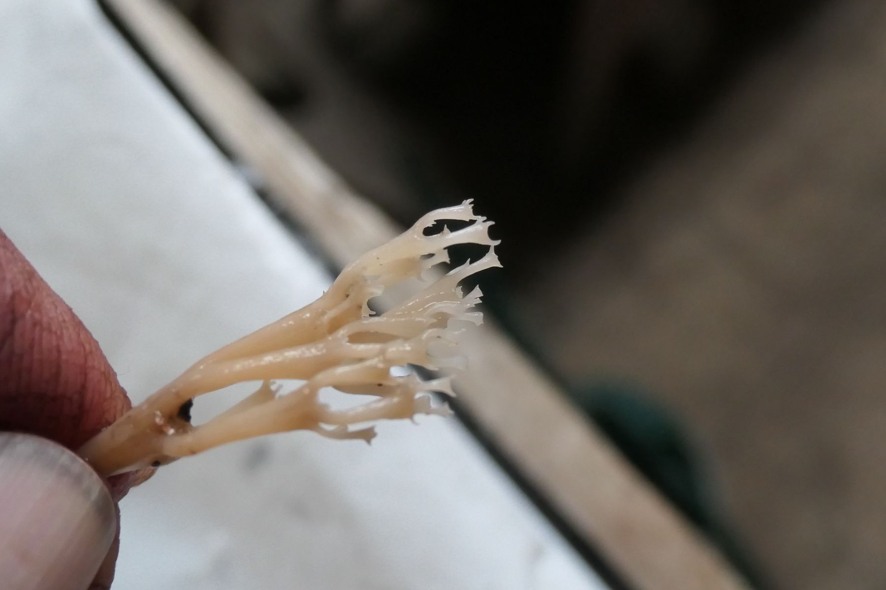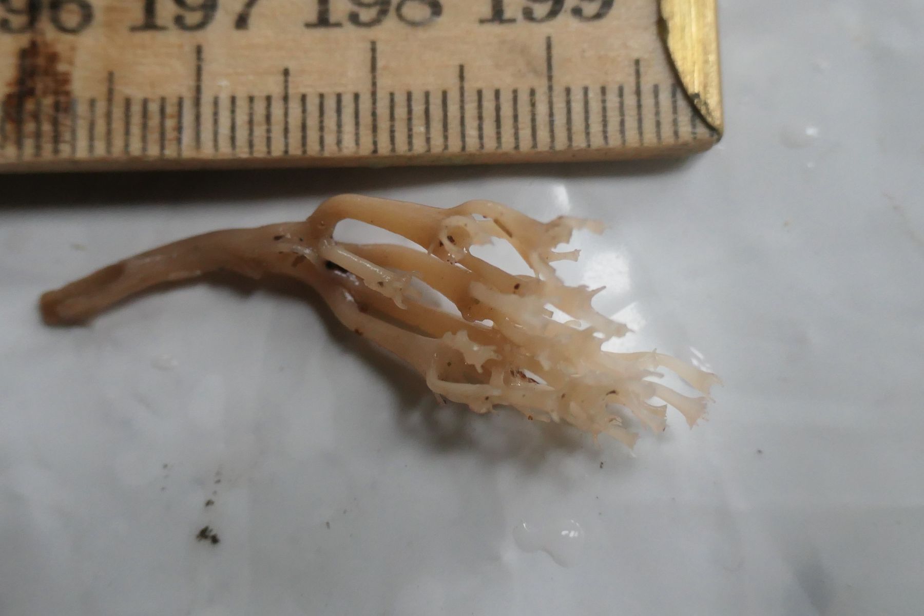 von denen ich leider keine Aufnahme habe. Eine mitgenommene Probe zeigt eine Becherkoralle - gemäss Kosmos 'Handbuch -Pilze' Artomyces pyxidata,