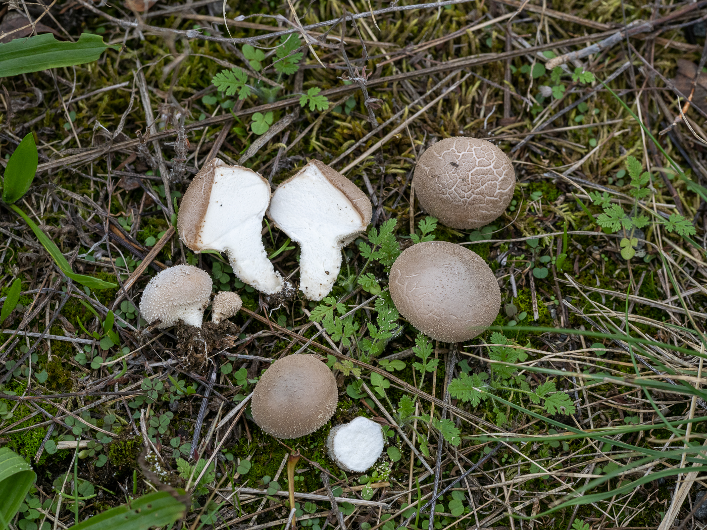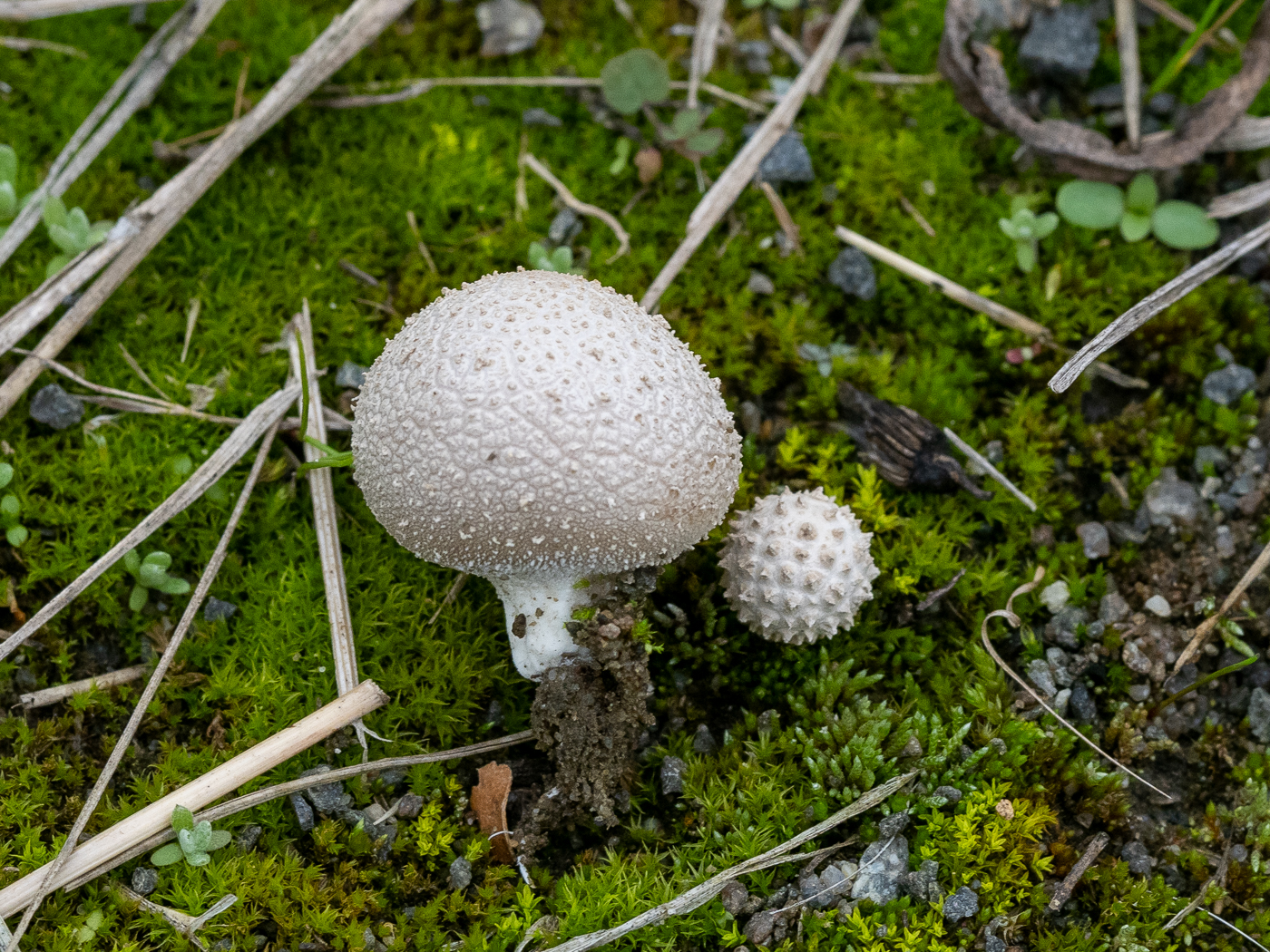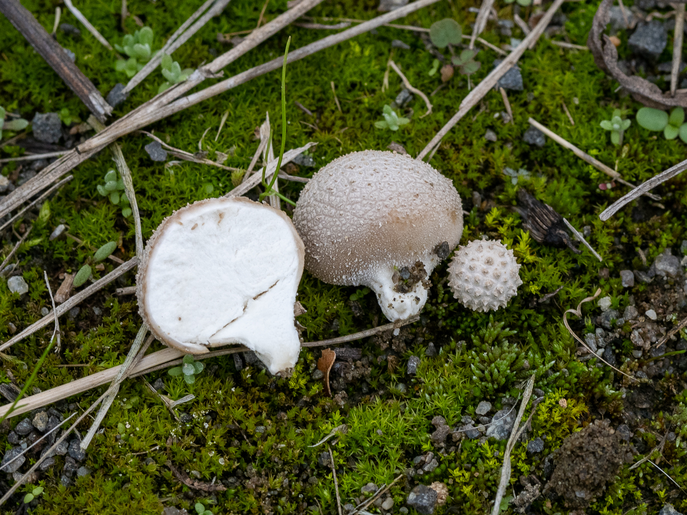 Leider habe ich auch keine richtige Idee. An Lycoperdon perlatum glaube ich nicht, auch L. lividium kenne ich anders, nicht mit so Stacheln auf der Peridie, mehr glatt.