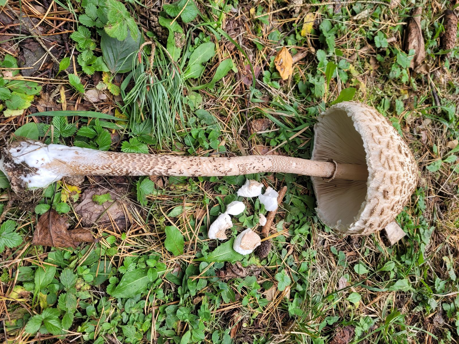 Stiel geschuppt, sehr lang 30cm eher mehr, unten knollig, der Ring ist abgefallen aber die Rosette noch am Stiel und verschiebbar.