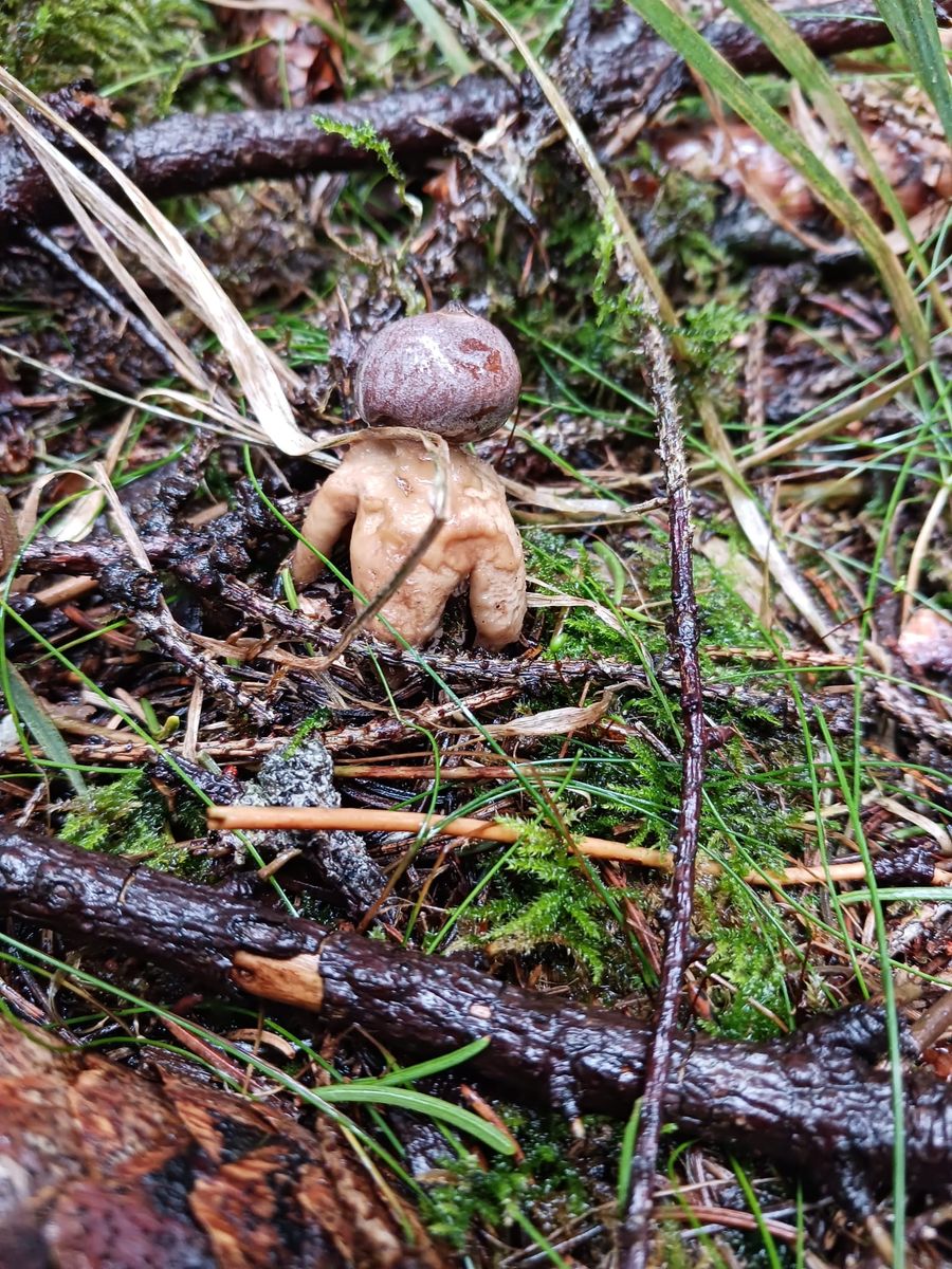 Waren heute im Wald und ein Pilz entdeckt den wir noch nie getroffen haben. Kleine braune Kugel Kappe mit einen kleinen Loch zentriert. Pilz hat 4 wurzelbeine und ca 4 cm gross. Weiß jemand was das ist?