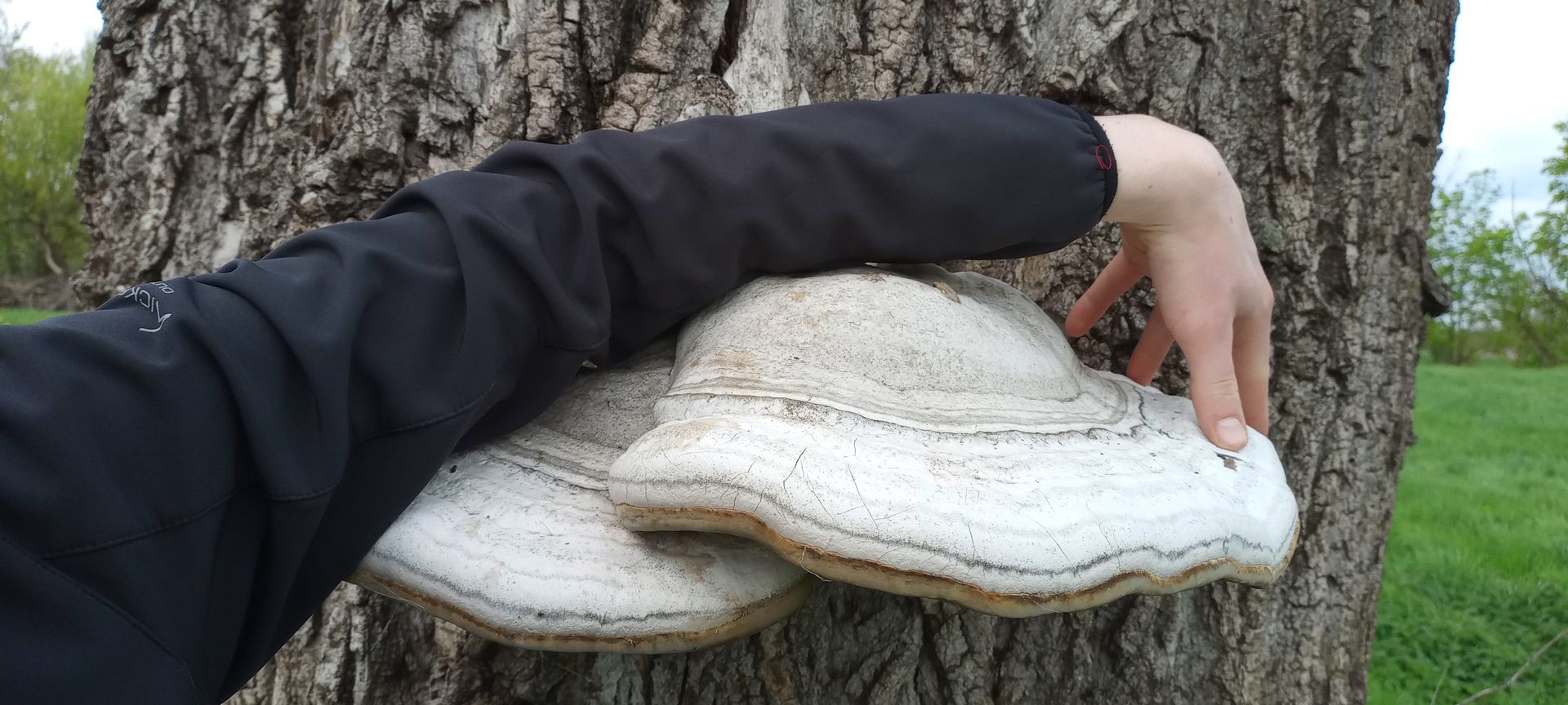 Mein erster Schuppiger Porling (März 2025). Leider habe ich vor kurzem viele meine Fotos verloren, darunter auch das Foto, an dem meine Hand auf dem Pilz lag. Die Breite des einzelne FK geht über 30 cm ("Anglerffeeling" 40 cm ). Nach dem ich den Pilz entdeckt hatte, machten wir erst einen kleinen Spaziergang. 1 Stunde später, als ich das Foto machen wollte, wurde der oberste FK von jemandem abgebrochen.