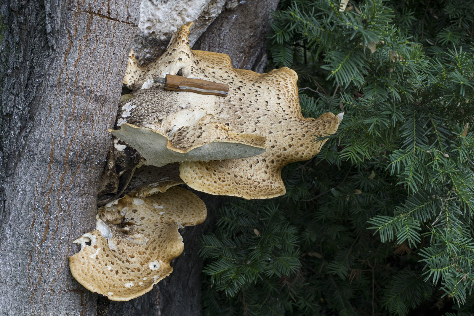 2.: Hier sagt es ja schon der Name: Meripilus giganteus. Dazwischen meine Tochter zum Größenvergleich. Gesehen in einem Park meiner Heimatstadt Wetzlar.