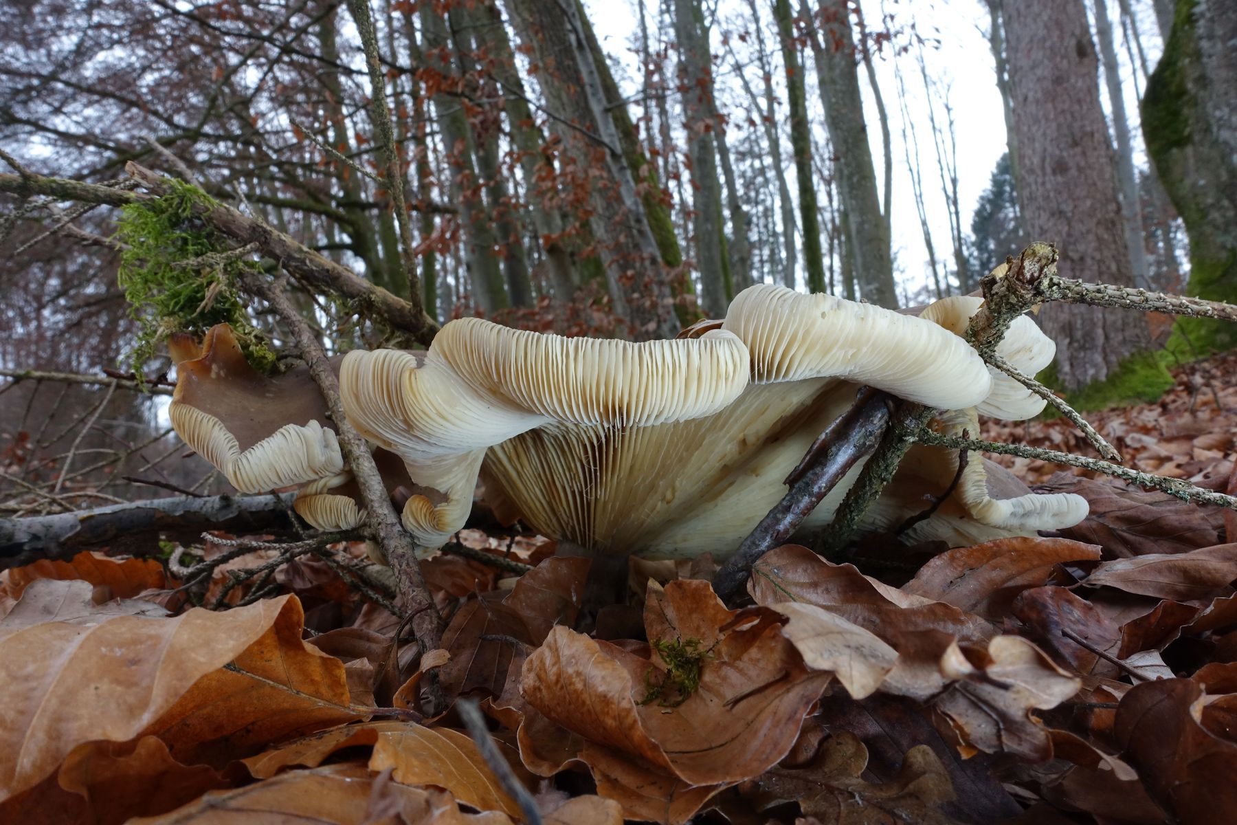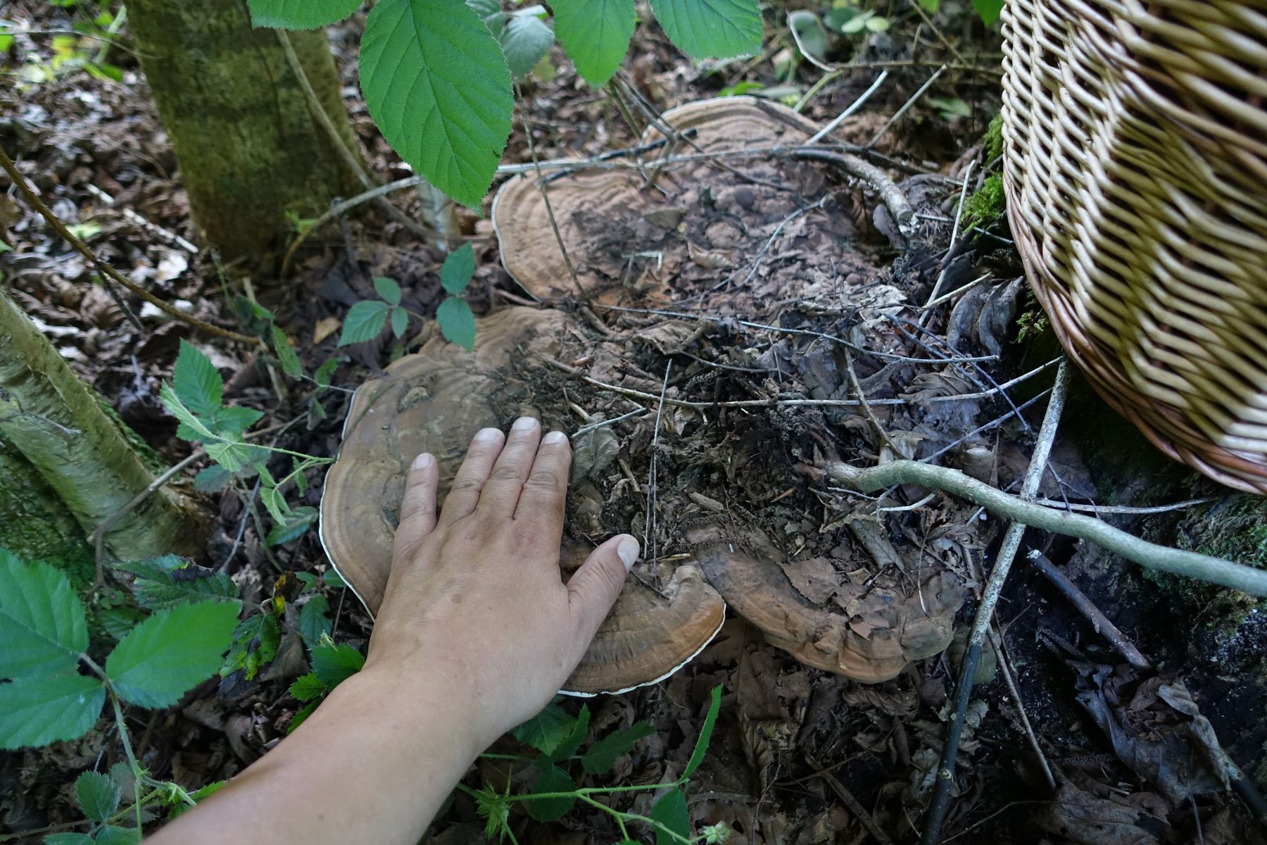 Zum Thema XXL Pilze kann ich auch noch einen beitragen: Pseudoinonotus dryadeus, Tropfender Schillerporling. Bilder meine Frau als Grössenvergleich. Hutdurchmesser 96cm.
