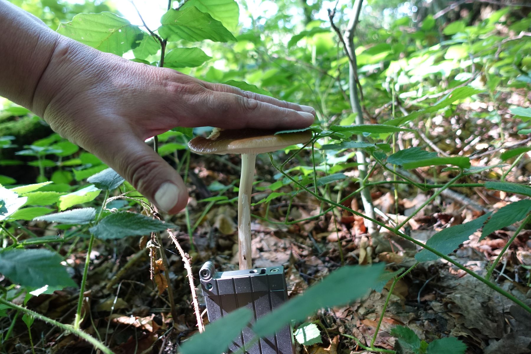 Hier noch ein Samtfußkrempling vom 19.7.25 (welche Freude, Hut, Stiel, "Lamellen"). Den werfe ich jetzt als XL-Junioren rein und werde ihn beobachten, wie er sich als XXL-Kandidat schlägt. 20 cm hat er schon, er muss seinen Durchmesser also verdoppeln. Ich drücke ihm die Daumen.