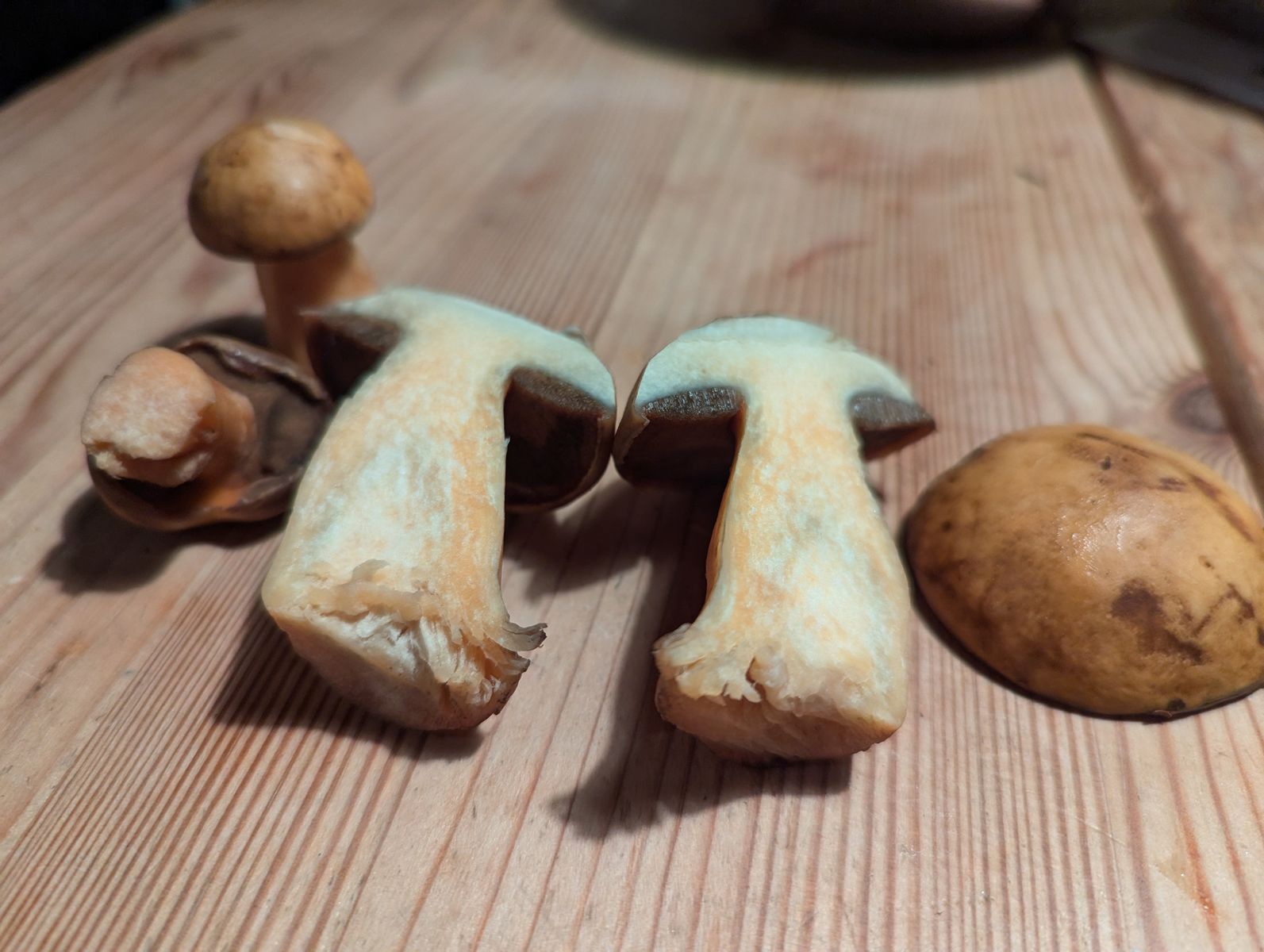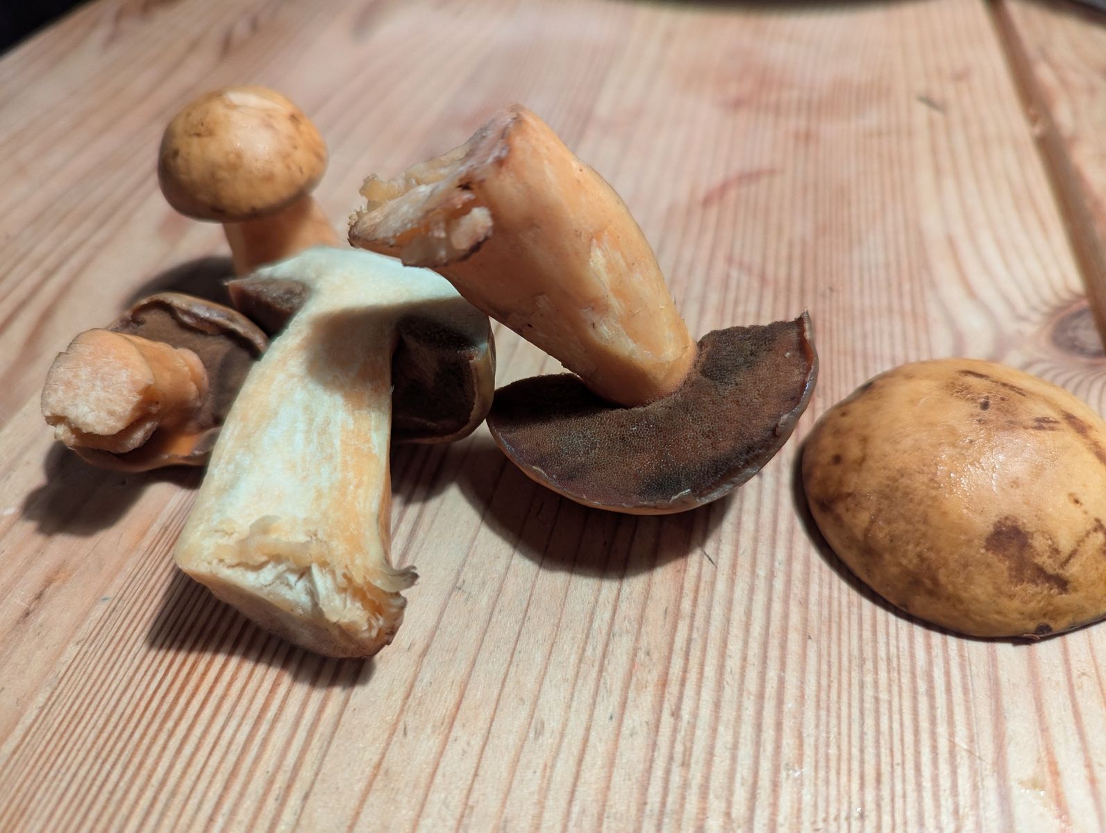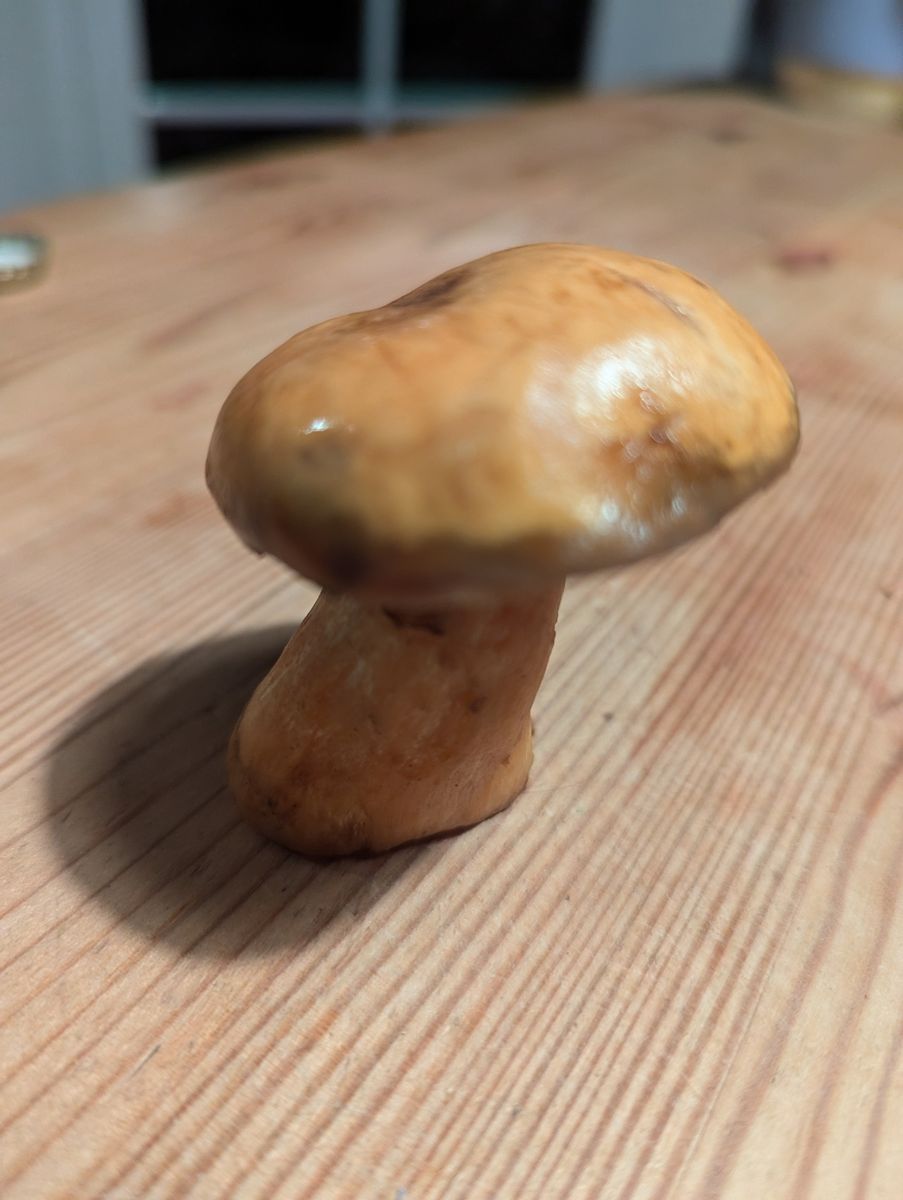 ich habe heute eine Pilzart gefunden, die ich beim besten Willen nicht einordnen kann. Ich dachte zuerst an einen hellen Hexenröhrling, aber der Pilz zeigt bei Schnitt keinerlei Blaufärbung, eher eine Orangefärbung. Für einen Sandröhrling sind mir die Poren zu fein und außerdem verfärben sich bei meinen Exemplaren die Poren dunkel auf Druck. Gefunden in Brandenburg unter überwiegend Kiefer bestand.