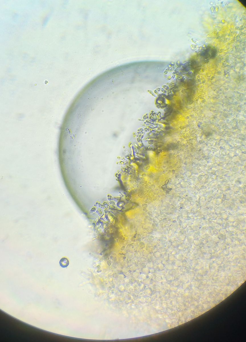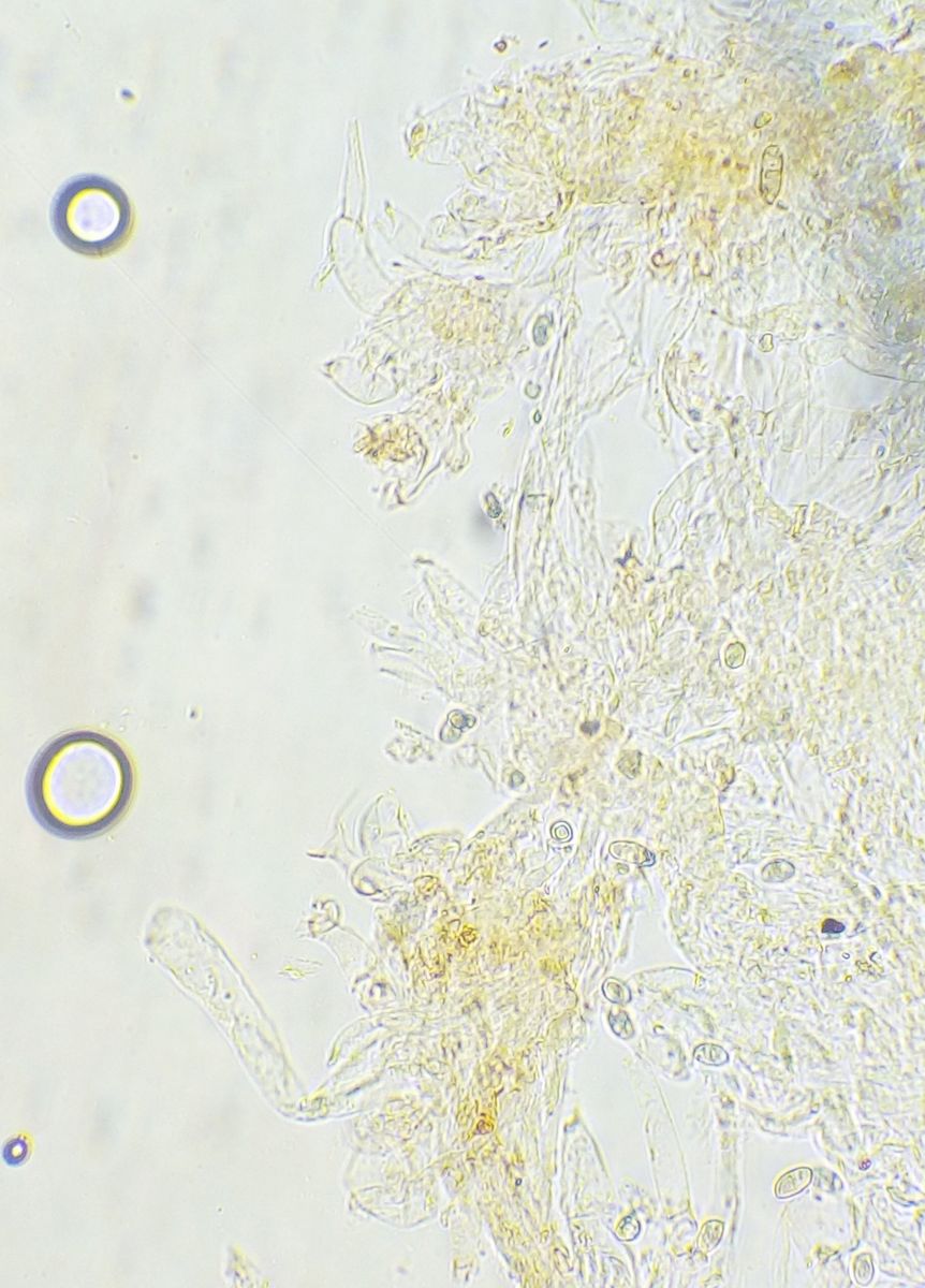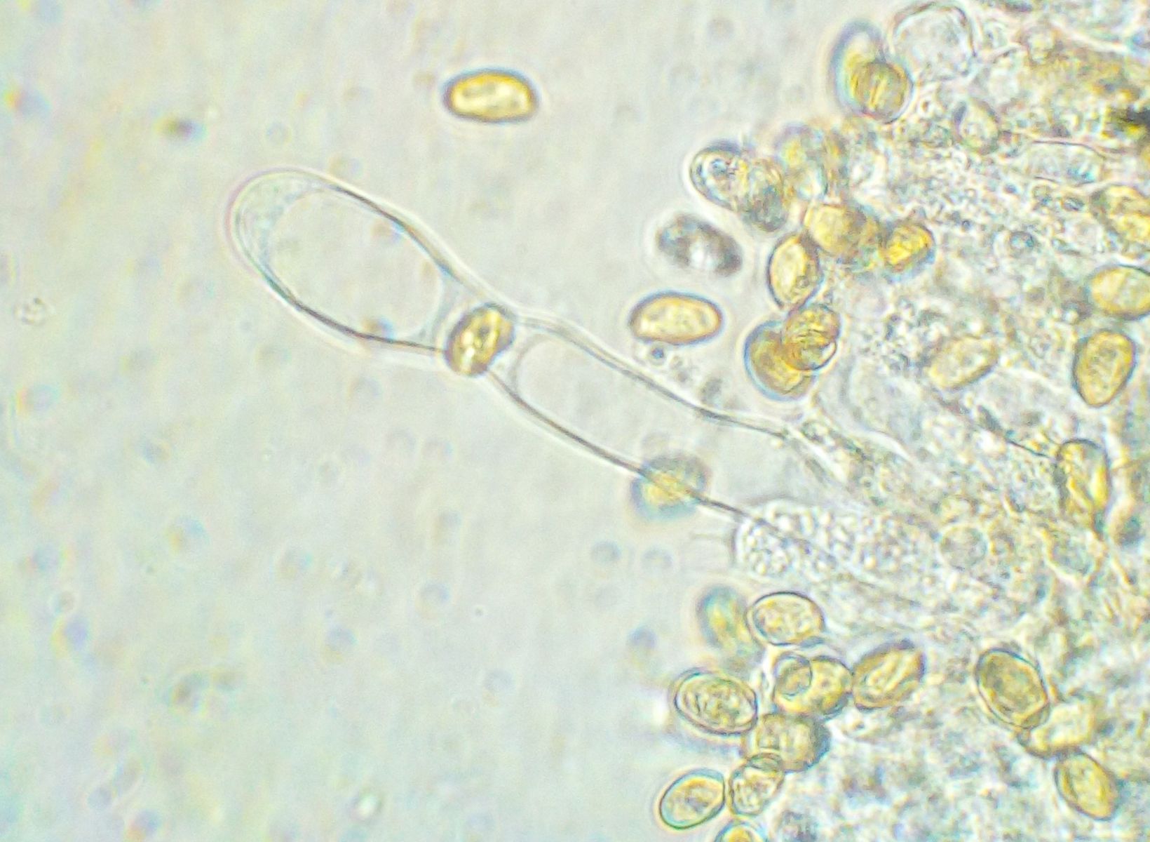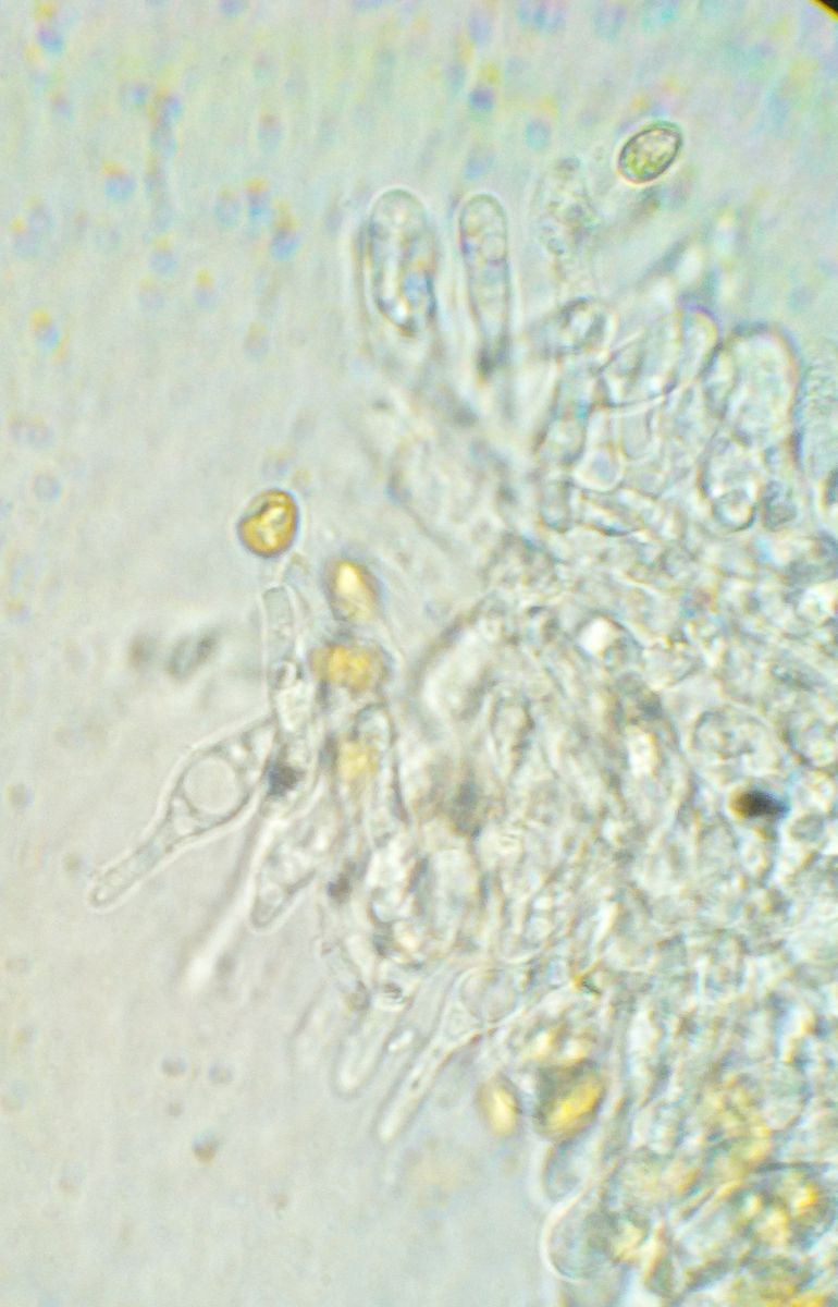 Sporen gelblich, deutlich umrandet, variabel, 7-10*5-6 µm, Basidie ~22 µm lang