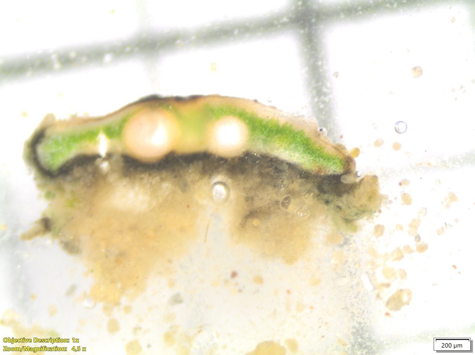 (4) Im dicken Schnitt weitgehend farblose Perithecien mit oberflächlicher Pigmentierung.