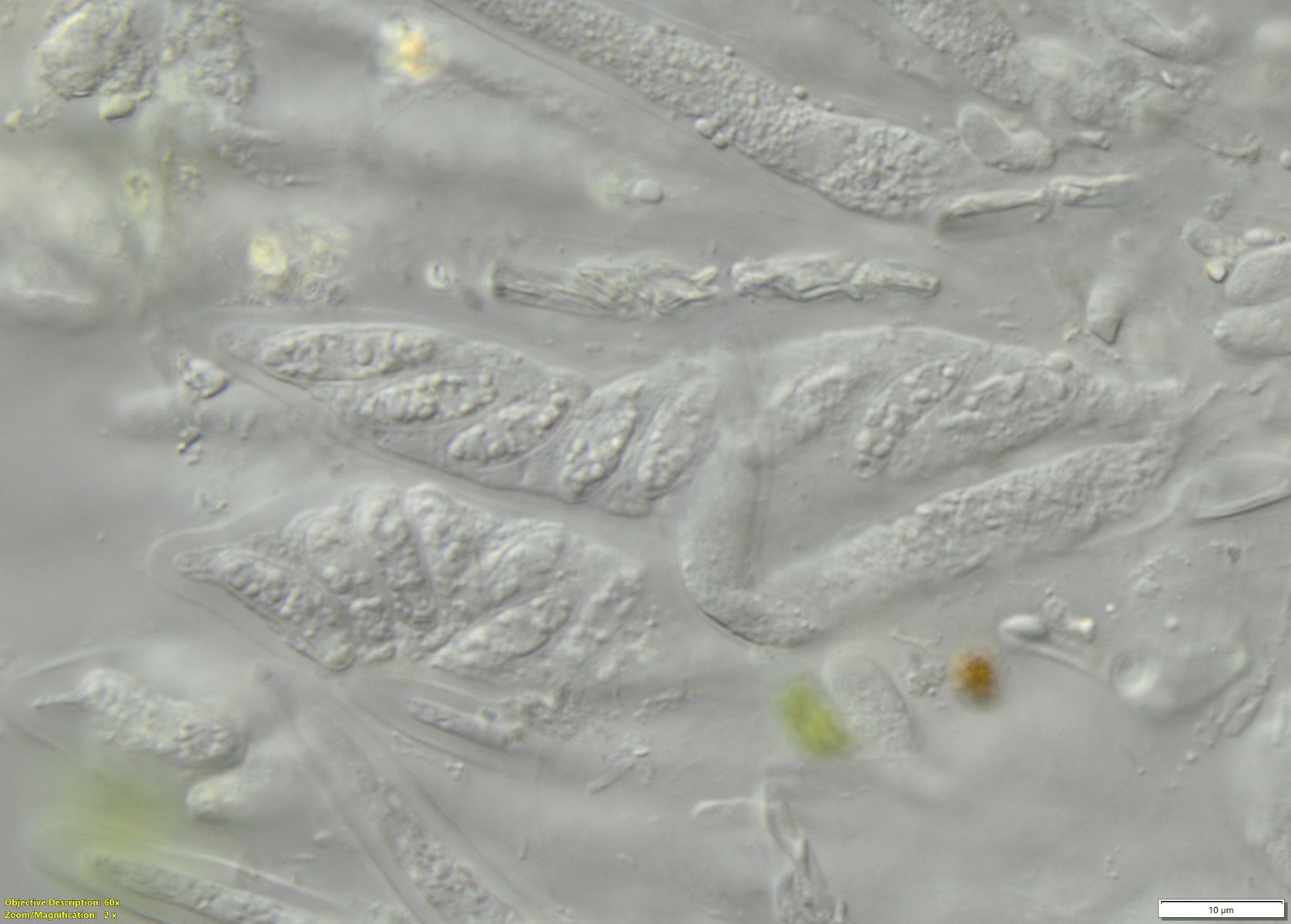 (6) Asci mit Sporen 15-16µm x 5,8-6,2µm. Von der Breite her im eher im Bereich von P. tenellum aber hier auch überlappend. Und ich habe noch nicht genug gemessen.
