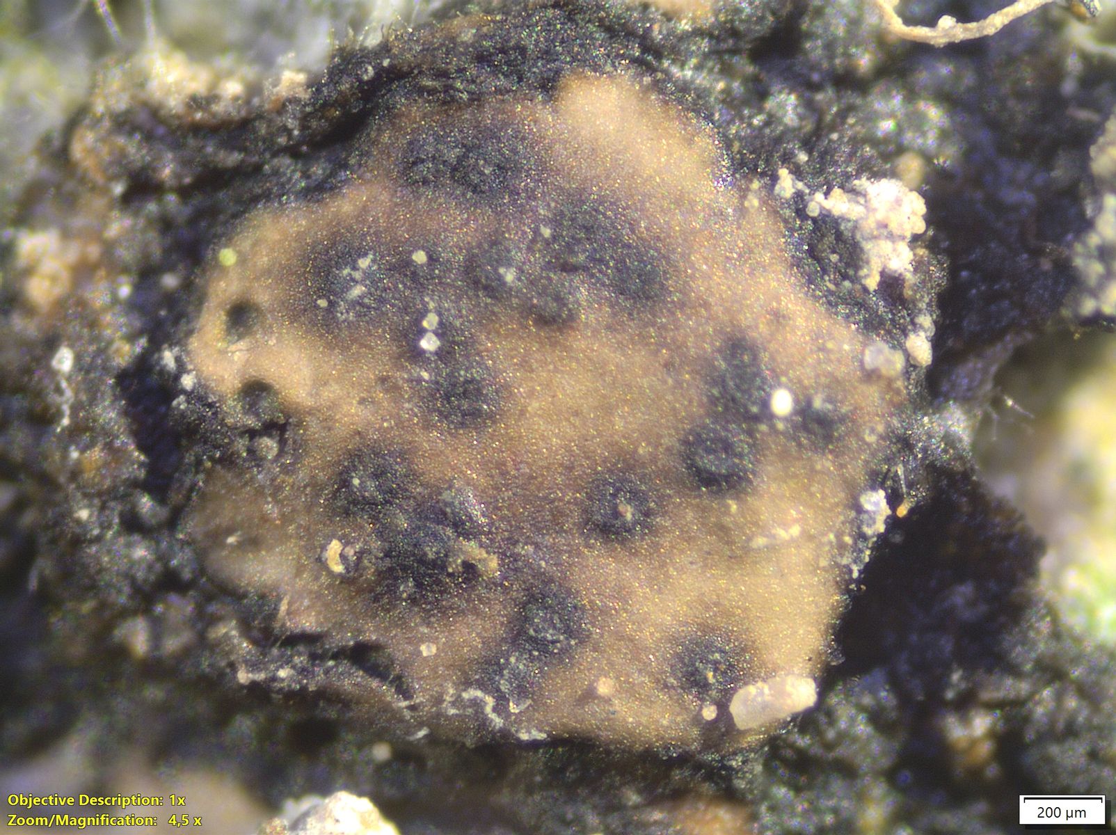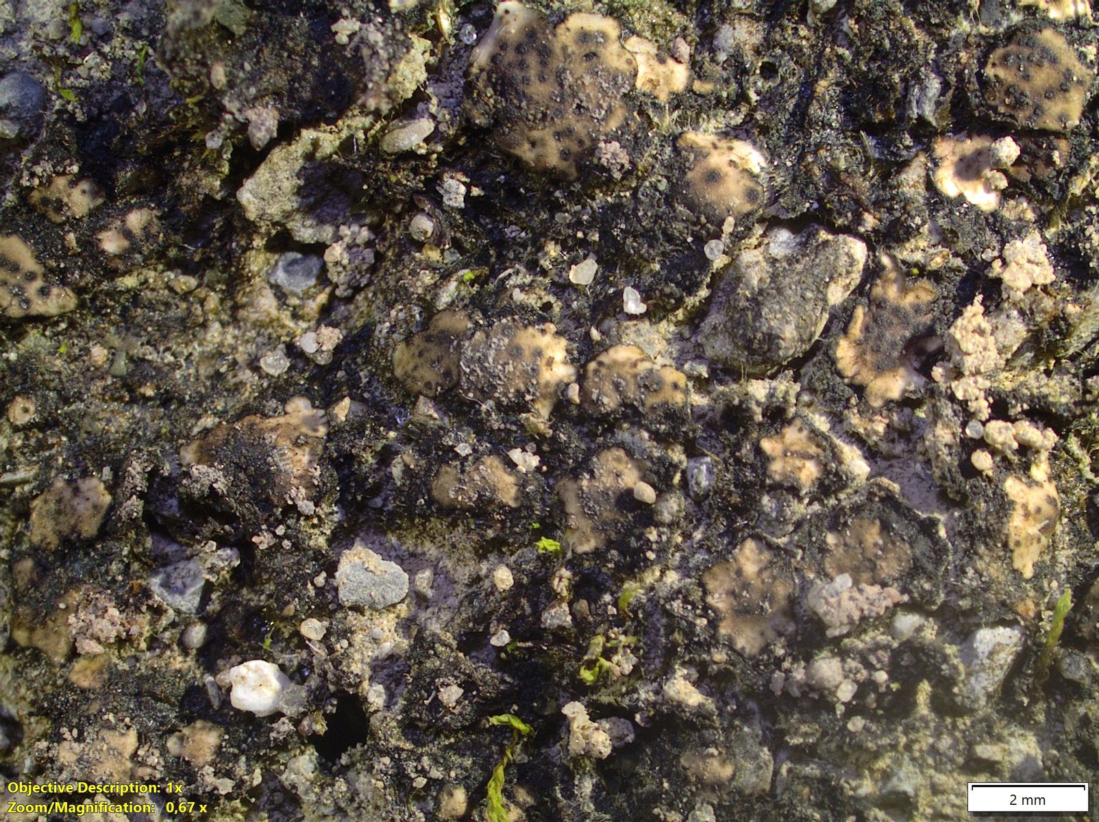 Nur die farblose Perithecienwand würde ich als hellbraun und nicht farblos erachten. Falls die Thallus-Unterseite schwärzlich wäre und die Perithecienwand unter 20µm dick wäre, könnte ev. doch eine andere Art vorliegen, das kannst du gerne gegenprüfen - ich glaube es jedenfalls nicht!