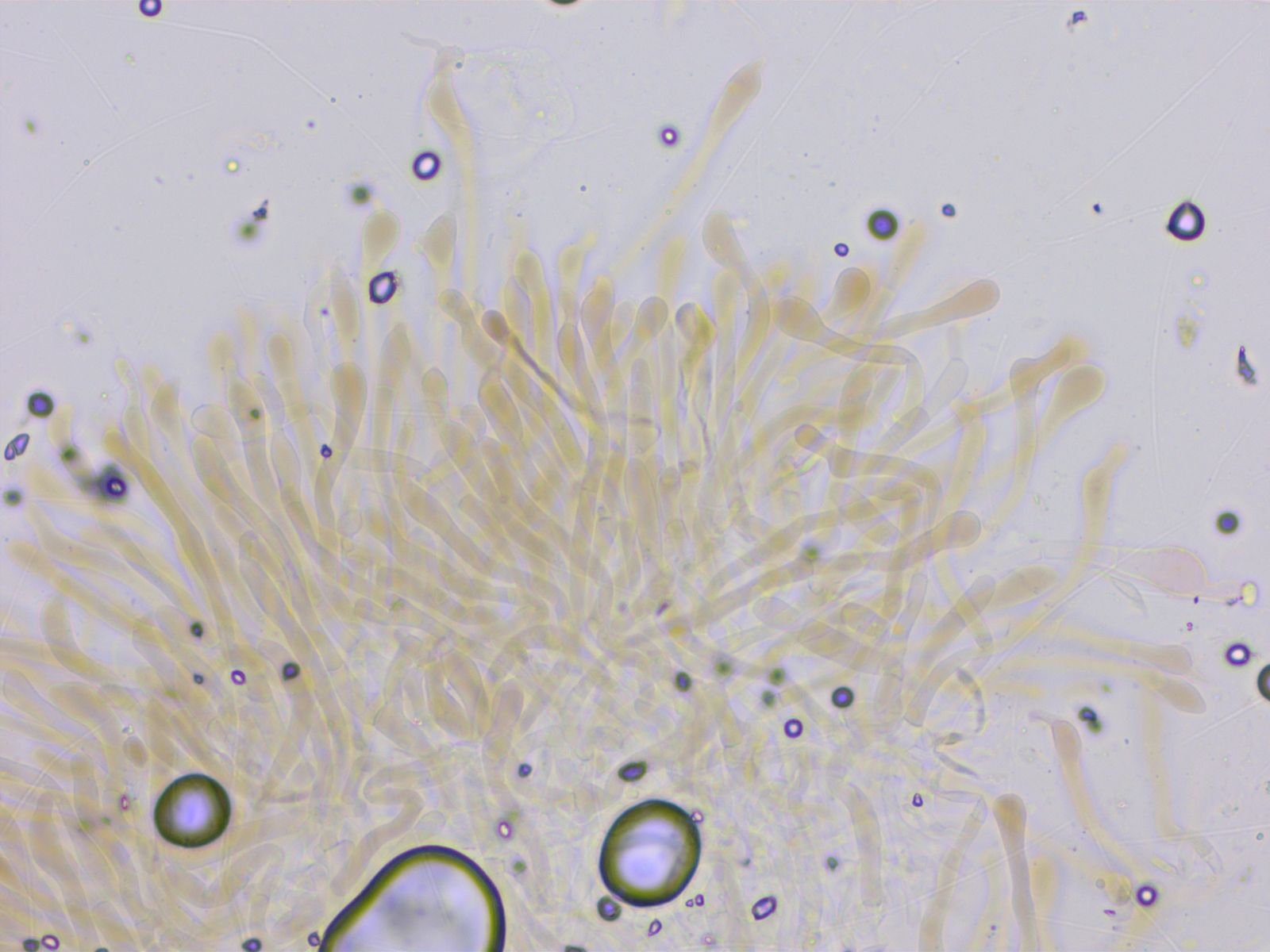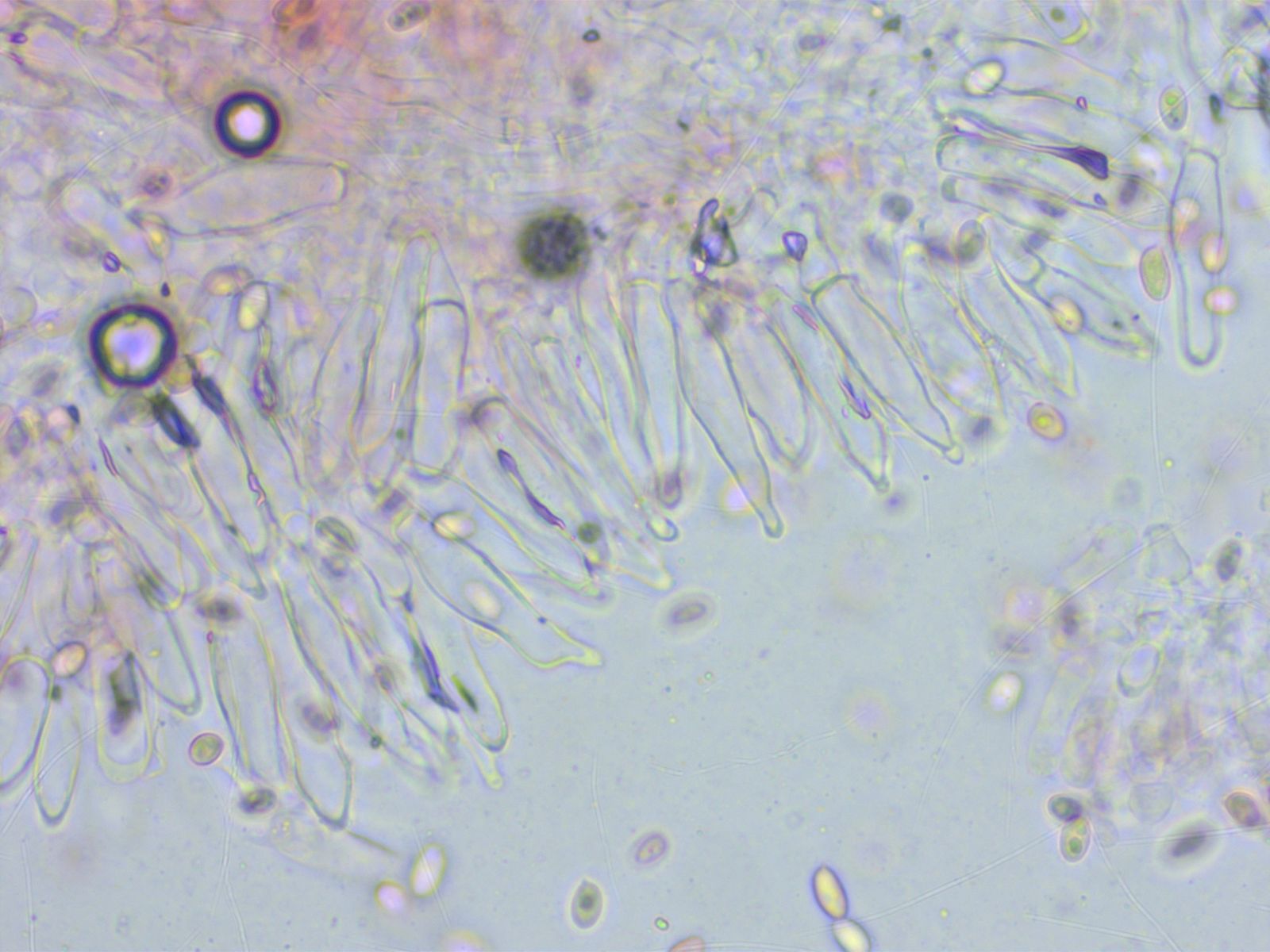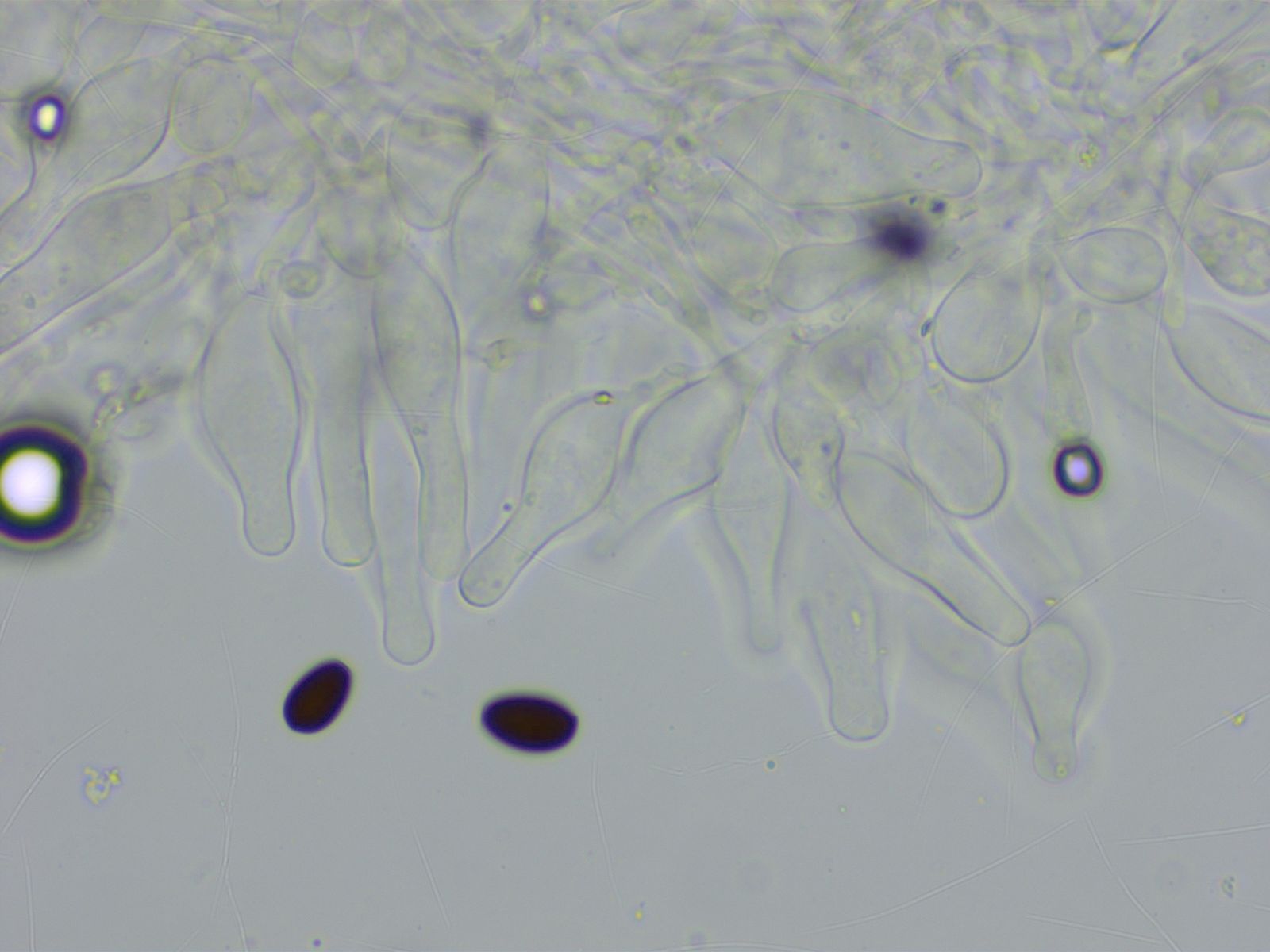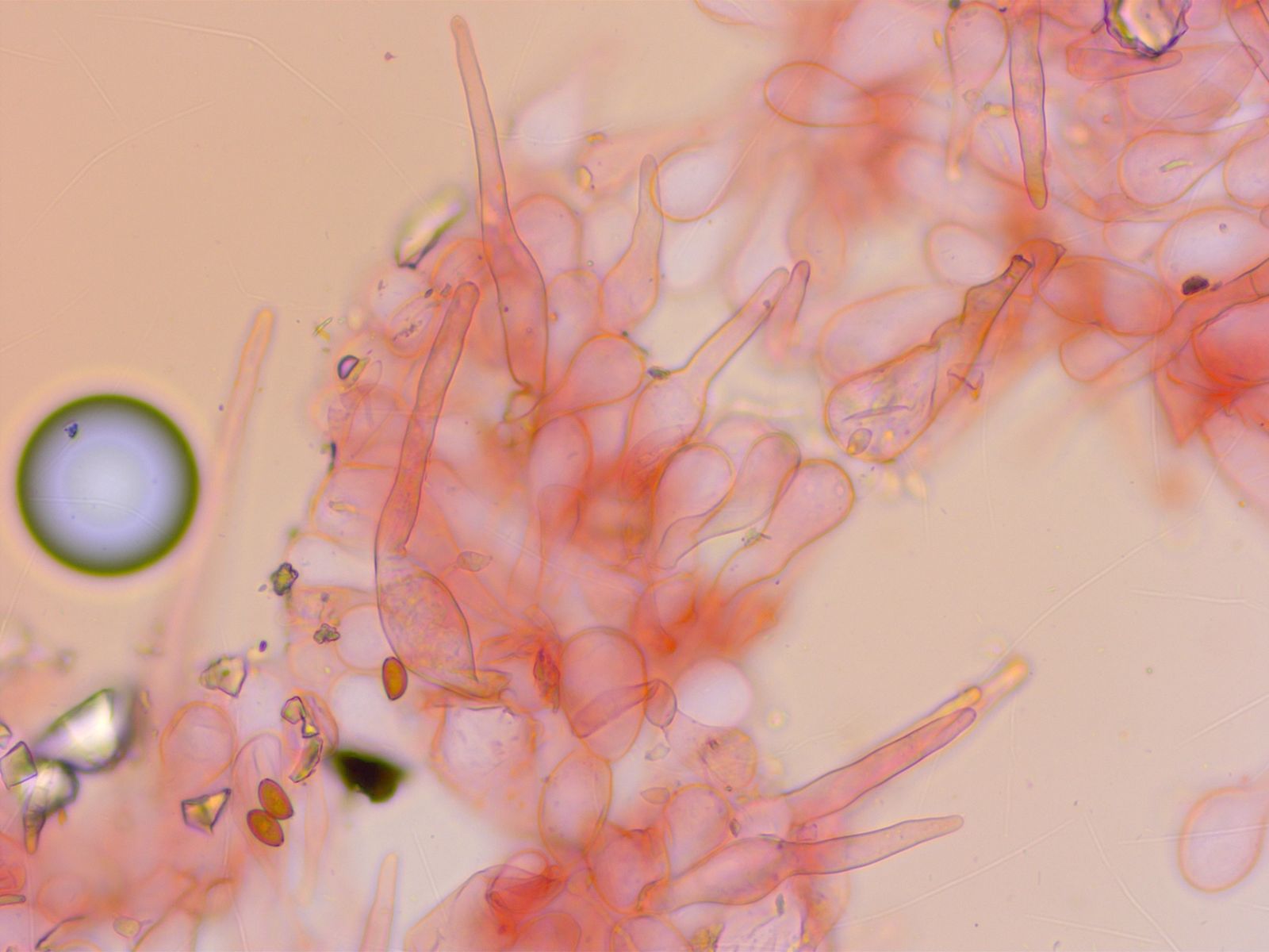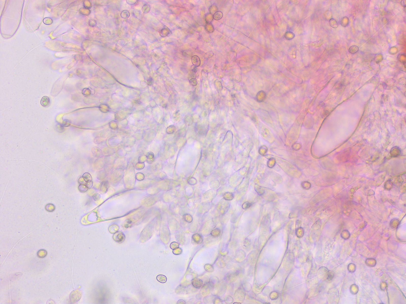 Cheilozystiden mit einer ganz typisch Form, bauchig mit spitzem Apex.