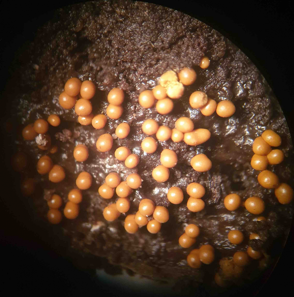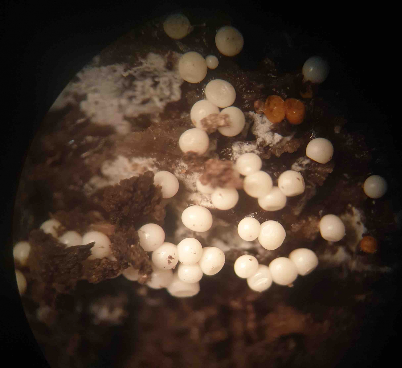 Ich habe diese Schleimpilze am 6.10. auf einem verrotteten Kirschstamm in einem Garten in Bielefeld gefunden. Der Durchmesser der einzelnen Kugeln beträgt etwa einen halben mm. Ich vermute die weißen Kugeln sind unreife Fruchtkörper der Art. Kann man an dem Foto erkennen, in welche Verwandschaft er gehört?
