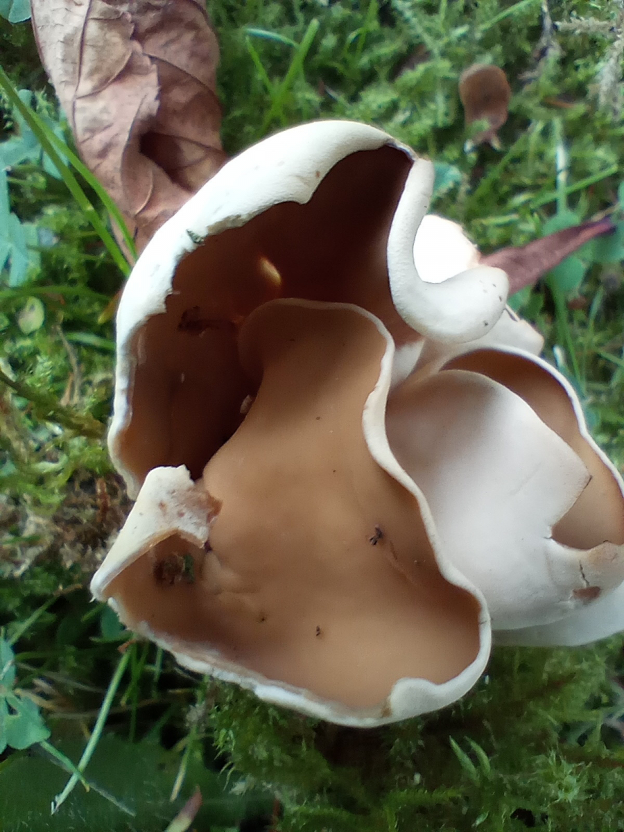 gestern fand ich unter einer alleinstehenden Eiche im Park mehrere dieser Fruchtkörper. Die Innenseite der becher- bis ohrförmigen Fruchtkörper sind etwas dunkler bräunlich gefärbt, die Oberfläche etwas glatter, als die Außenseite. Diese ist leicht samtig in hellerem Ocker. Das Fruchtfleisch noch einmal etwas heller, vielleicht cremeweiß. Auffällig: ich habe die aus einer gemeinsamen Basis gewachsenen Pilze entnommen und die haben erst mit zeitlicher Verzögerung deutlich gestäubt. Es wirkte, als gebe es einen von direkter Erschütterung autonomen Mechanismus.