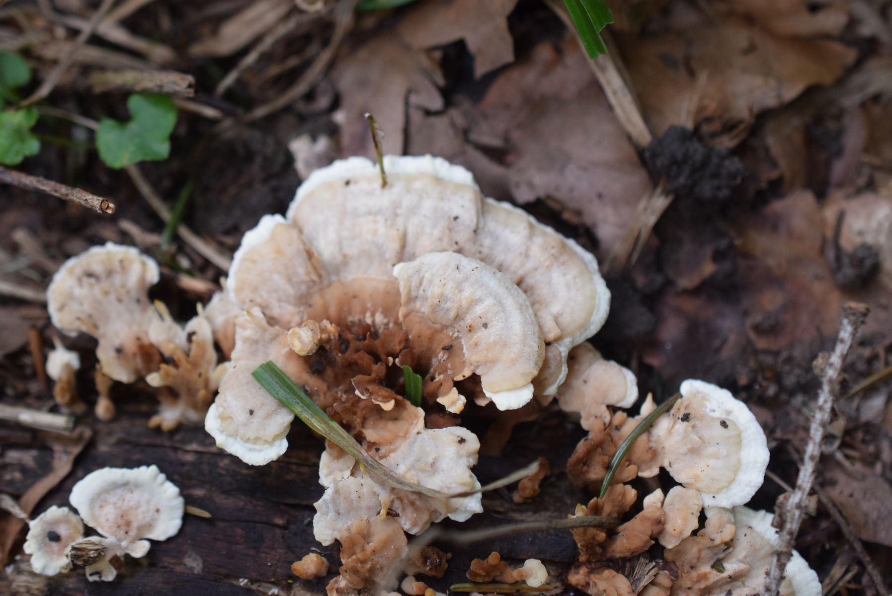 Vor ein paar Tagen war ich wieder an der Stelle, an der ich letztes Jahr diese Pilze gefunden habe, und habe gesehen, dass genau an der Stelle, an der die alten Pilze waren, jetzt neue Pilze wachsen. Ich erkannte sofort, dass es sich um einen Trametopsis cervina-Pilz handelte. Direkt neben diesen jungen Pilzen sieht man einen alten, der vom letzten Jahr übrig geblieben ist (siehe Bild).