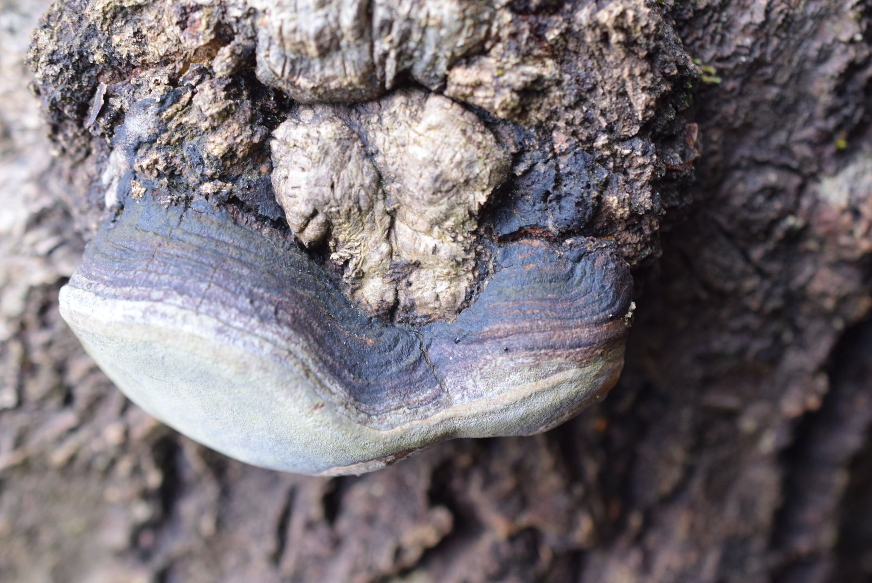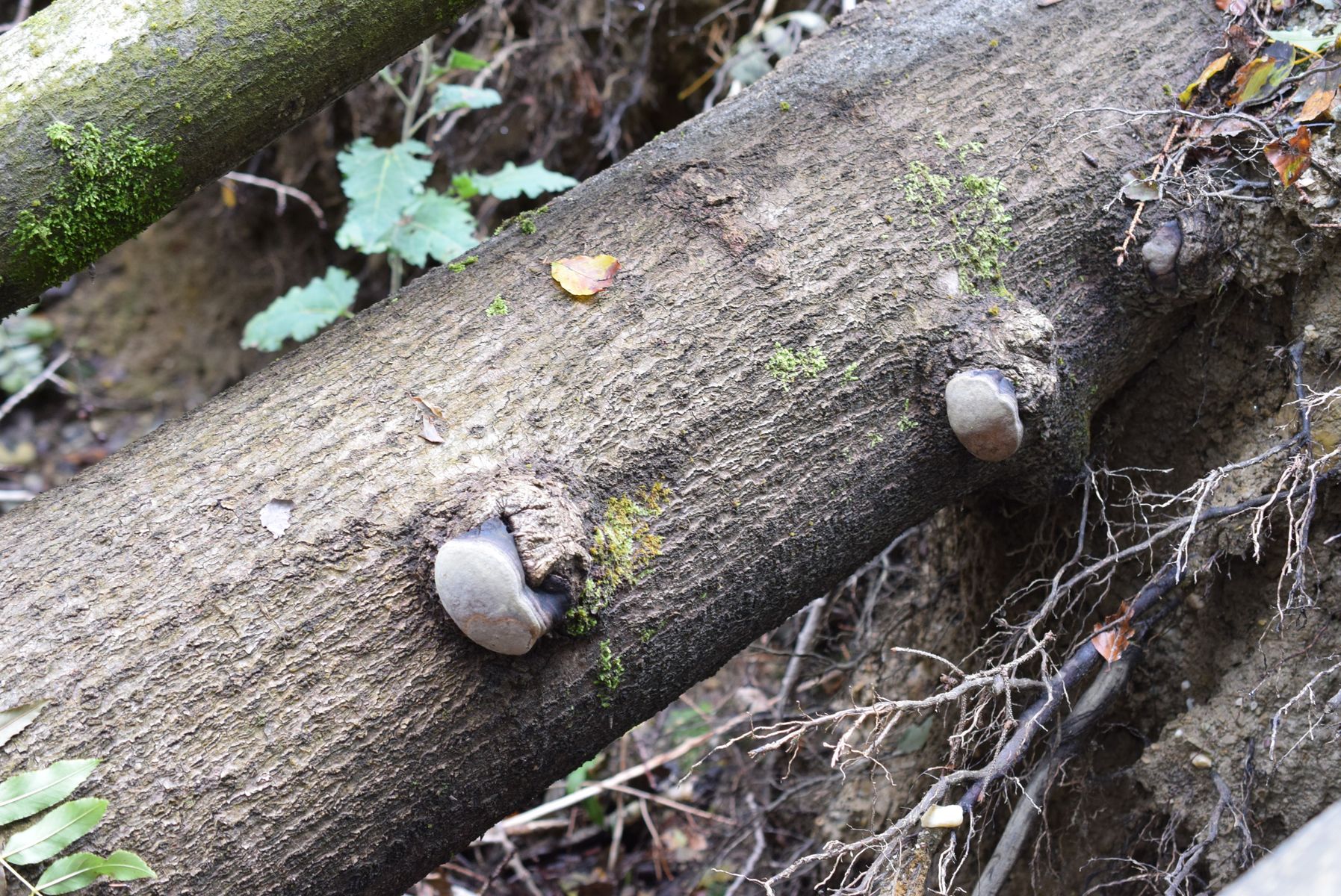 Am linken Ende des Stammes befinden sich neue große Pilzexemplare und am rechten Ende befanden sich die alten Pilze des letzten Jahres