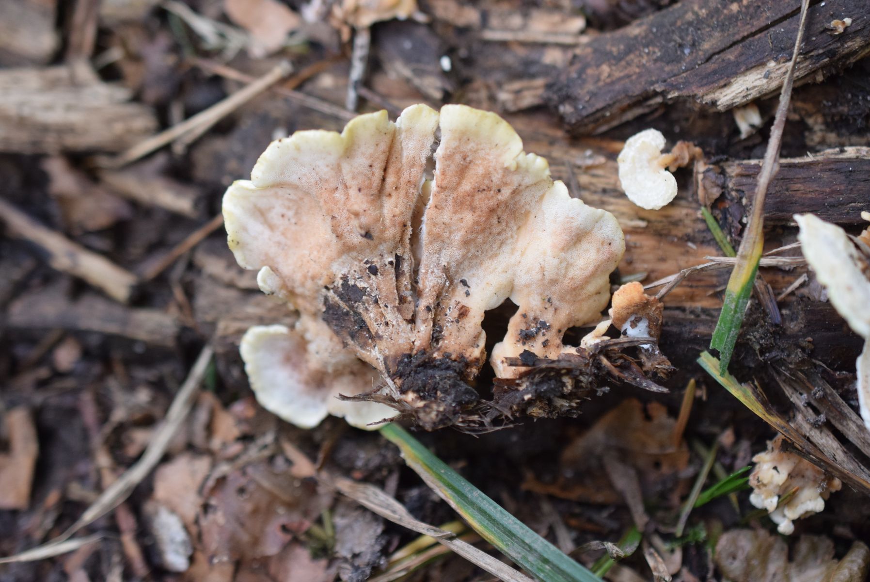 Vor ein paar Tagen war ich wieder an der Stelle, an der ich letztes Jahr diese Pilze gefunden habe, und habe gesehen, dass genau an der Stelle, an der die alten Pilze waren, jetzt neue Pilze wachsen. Ich erkannte sofort, dass es sich um einen Trametopsis cervina-Pilz handelte. Direkt neben diesen jungen Pilzen sieht man einen alten, der vom letzten Jahr übrig geblieben ist (siehe Bild).