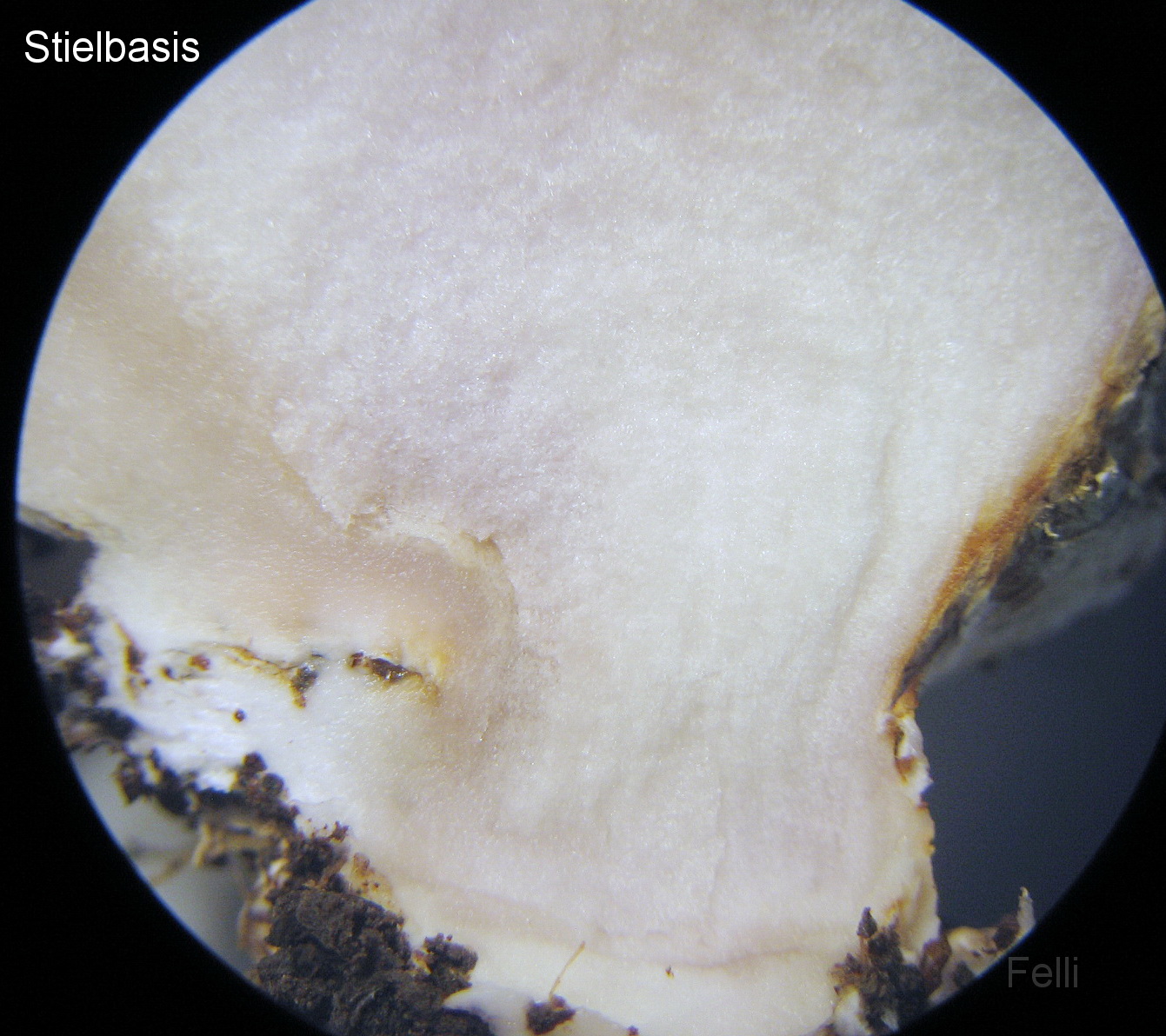 Stiel mit Tendenz auszuhöhlen 6-10 cm hoch, 2 - 3,5 cm dick, zylindrisch - leicht keulig mit zugespitzter ( leicht wurzelnder ?) Basis. Basisfleisch auch leicht violett gefärbt