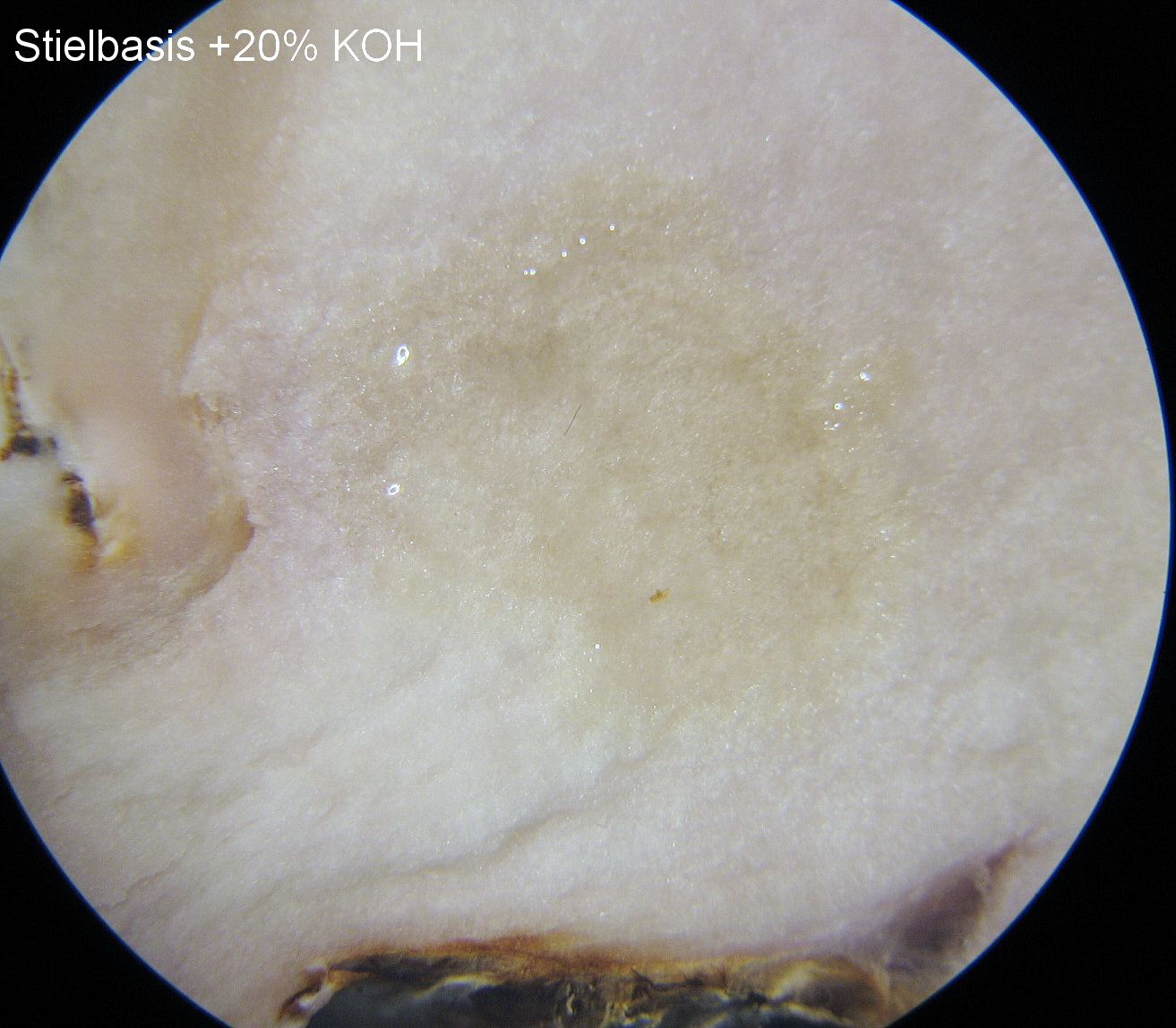 KOH 20% auf Stielbasisfleisch ganz leicht gelblich.