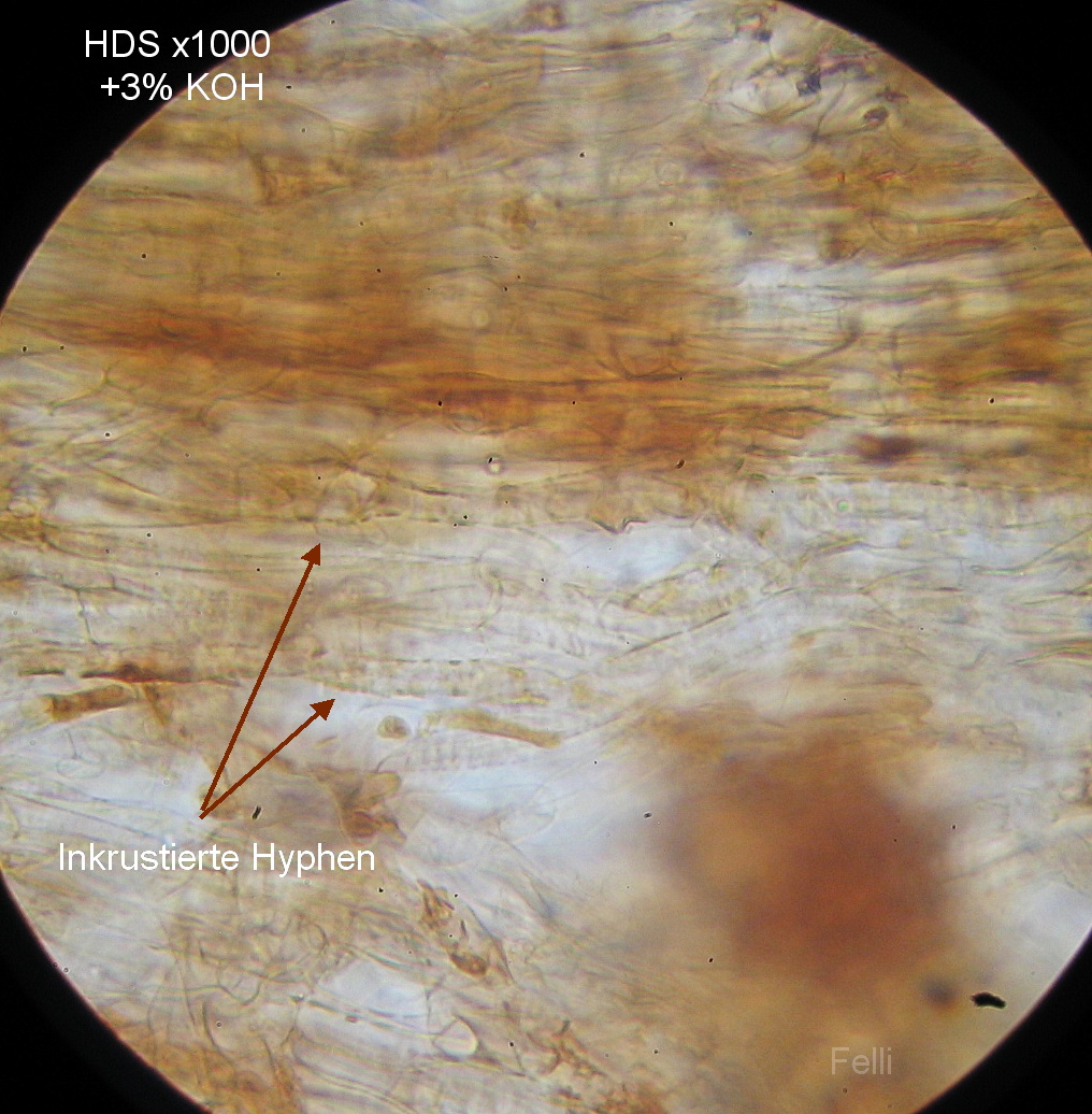 Huthauthyphen teils deutlich inkrustriert, einzelne Hyphen mit gelbbräunlichem Inhalt.