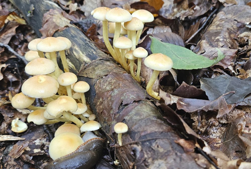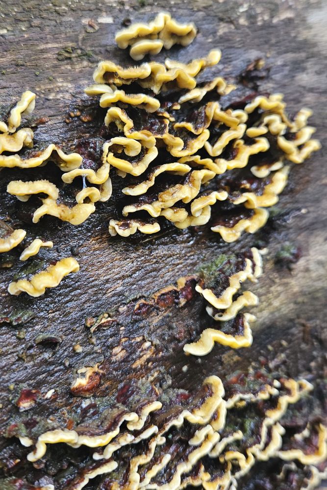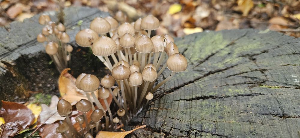 26. Eine mir unbekannte, büschelig wachsende Helmlingsart auf Totholz. Leider habe ich kein einziges Bild von den Lamellen gemacht.