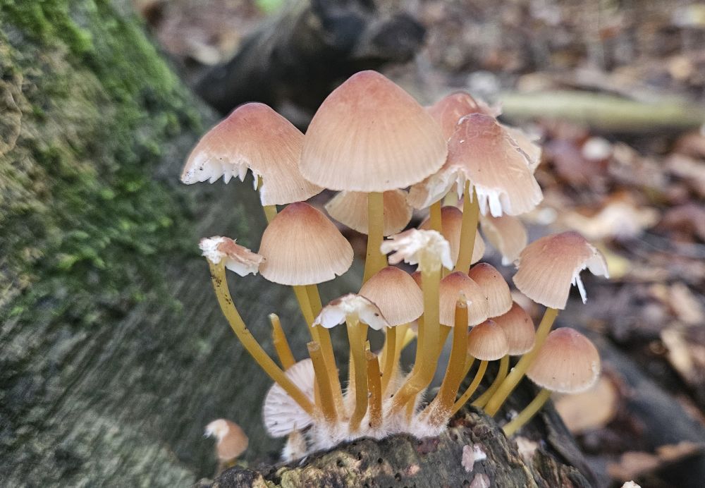 26. Eine mir unbekannte, büschelig wachsende Helmlingsart auf Totholz. Leider habe ich kein einziges Bild von den Lamellen gemacht.
