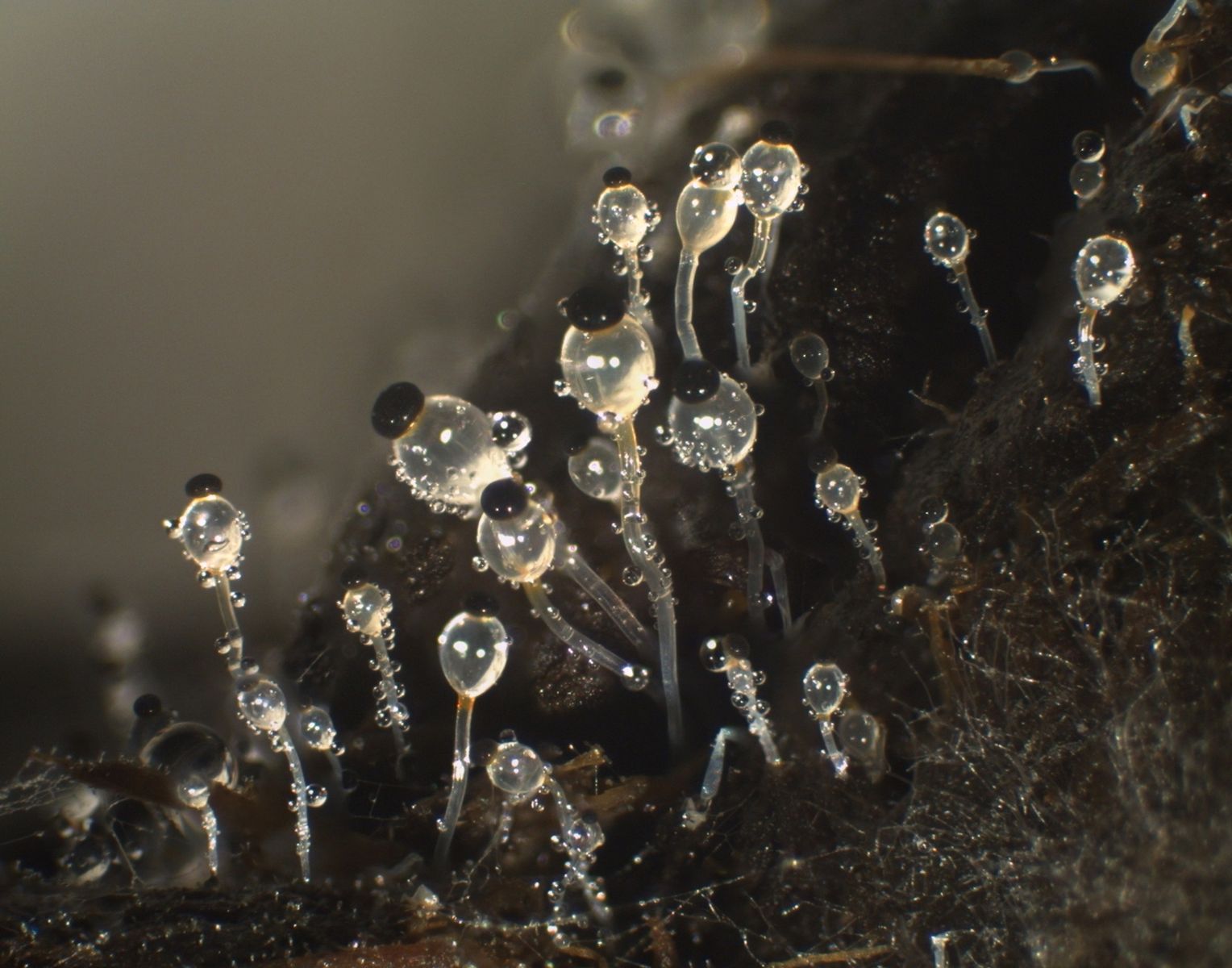 Ein Pilobolus auf Rind, den ich, weil nichts anderes ging, als Pilobolus cf crystallinus bestimmt habe, möchte ich gerne sicher bestimmt haben, deshalb würde ich mich über Eure Hilfe freuen.