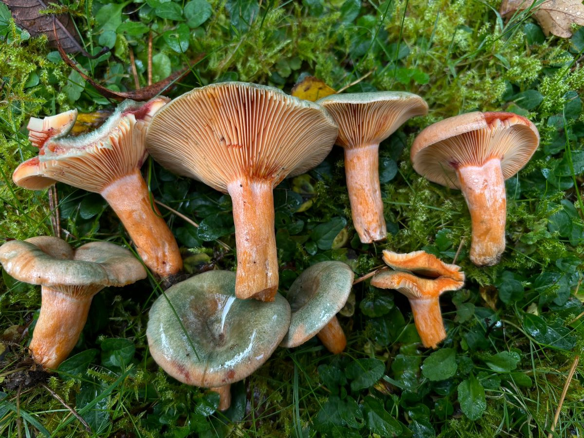 diese Reizker-Gruppe hatte ich heute unverhofft auf dem Friedhof gefunden. Zuerst dachte ich an geschädigte Fichten-Reizker, da alle Hüte (selbst jung) schon grün gefärbt waren aber irgendwie kamen sie mir bei genauerer Betrachtung doch anders vor. Grübchen waren keine oder nur verzeinzelt am Stiel zu sehen, jedoch standen die Fruchtkörper unter einer Kiefer. Als sich die Bruchstellen innerhalb von 3-5 Minuten blutrot verfärbten war die Sache klar.Grüße an Hannes2 , ich glaub' ich schule zum Parkologen um.