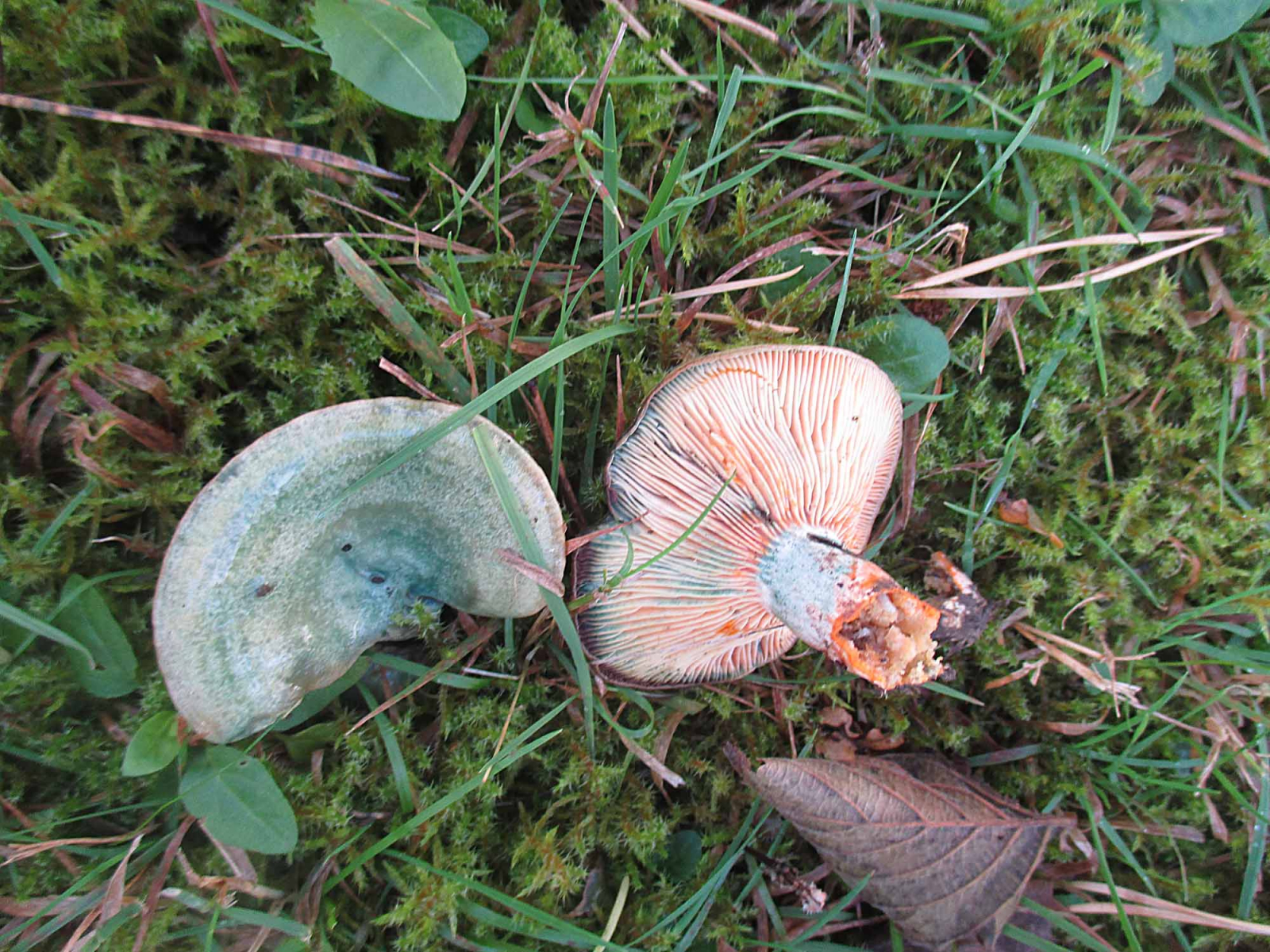 diese Reizker-Gruppe hatte ich heute unverhofft auf dem Friedhof gefunden. Zuerst dachte ich an geschädigte Fichten-Reizker, da alle Hüte (selbst jung) schon grün gefärbt waren aber irgendwie kamen sie mir bei genauerer Betrachtung doch anders vor. Grübchen waren keine oder nur verzeinzelt am Stiel zu sehen, jedoch standen die Fruchtkörper unter einer Kiefer. Als sich die Bruchstellen innerhalb von 3-5 Minuten blutrot verfärbten war die Sache klar.Grüße an Hannes2 , ich glaub' ich schule zum Parkologen um.