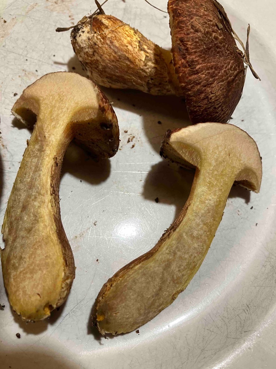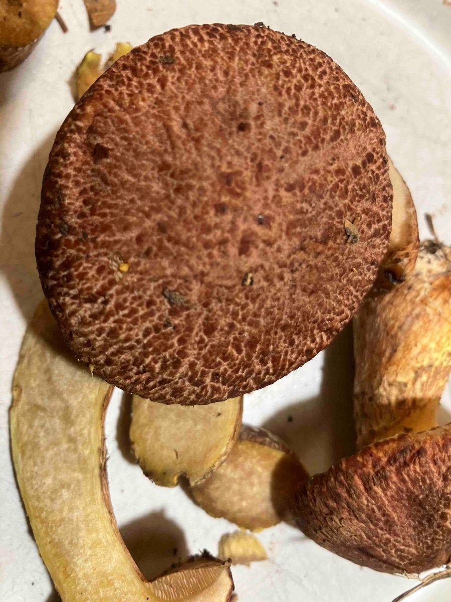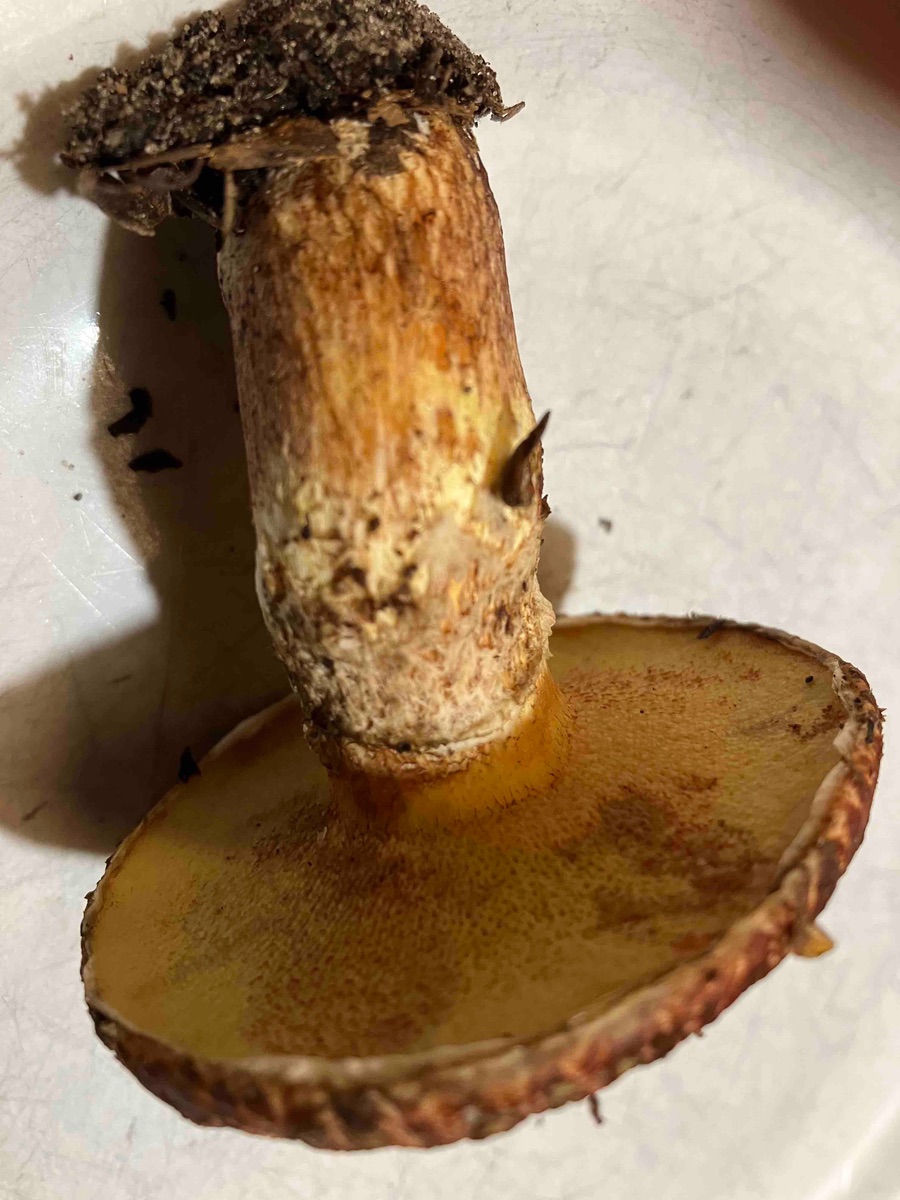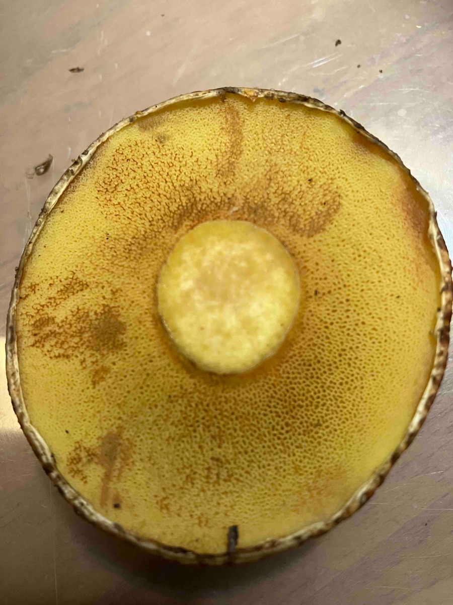 Das durchweg gelbe Fleisch blaut nicht, vielmehr wird es nach einiger Zeit erst grau, und dann deutlich rosarot. Es sind Reste einer Teilhülle sichtbar. Gegen den geschmückten bzw. weinroten Röhrling spricht, dass dieser deutlich größere Röhrenmündungen hat und hier außerdem nicht vorkommen dürfte. Dafür spricht jener mir unbekannte Baum, der mir trotz der Entfernung nun im Nachhinein doch bedeutsam erscheint …