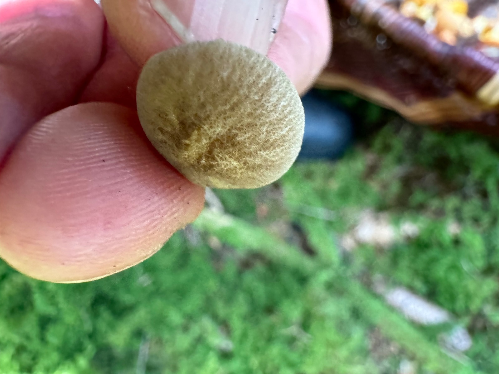 Lamellen frei, Hut grau mit leichtem Gelbstich, haarig, ca. 2 cm, Stiel glatt, weiß, längsfaserig. Geruch nicht unangenehm.