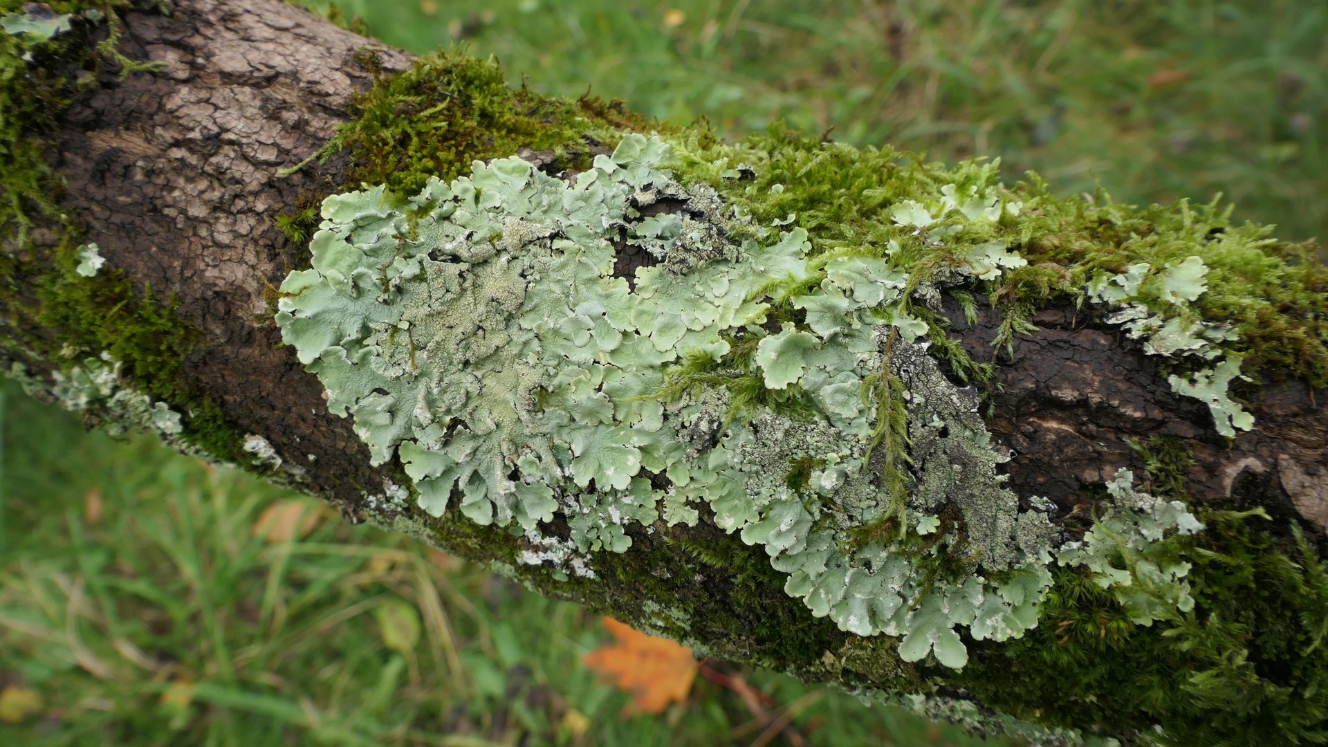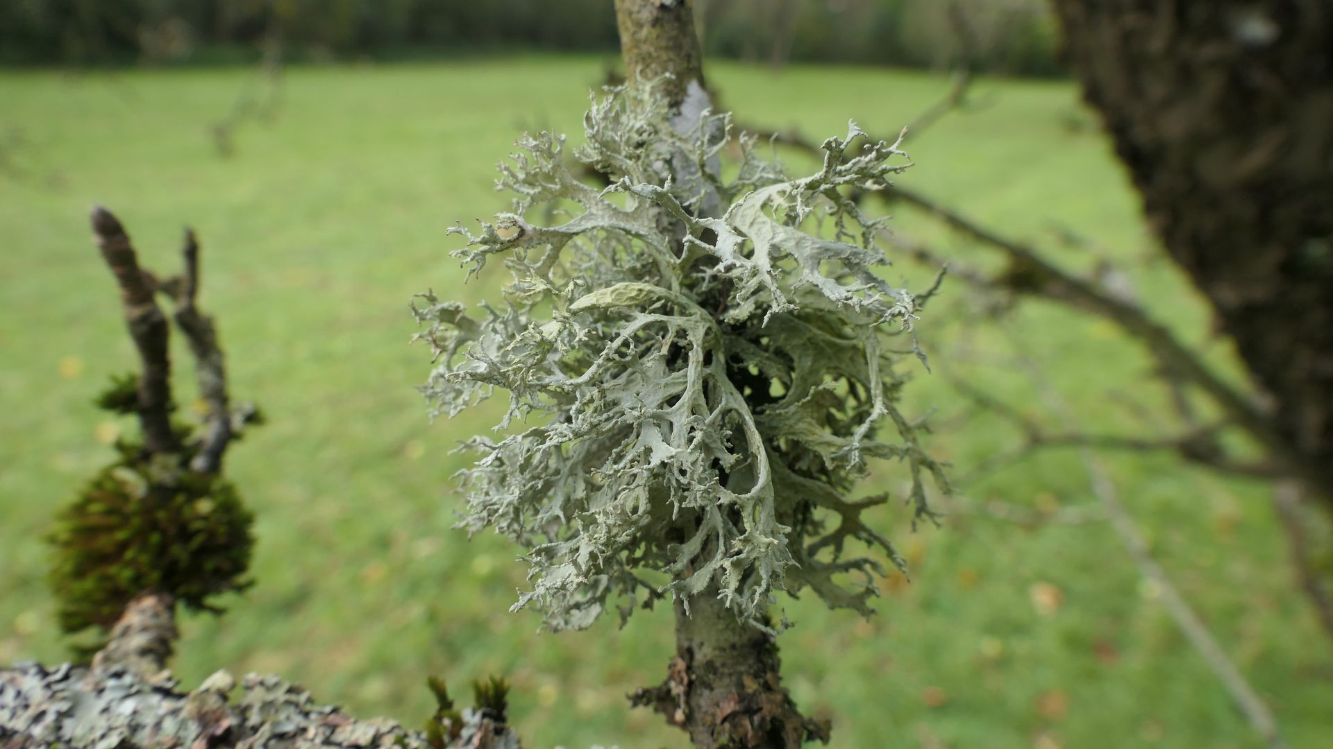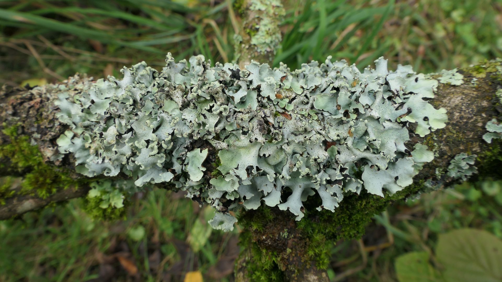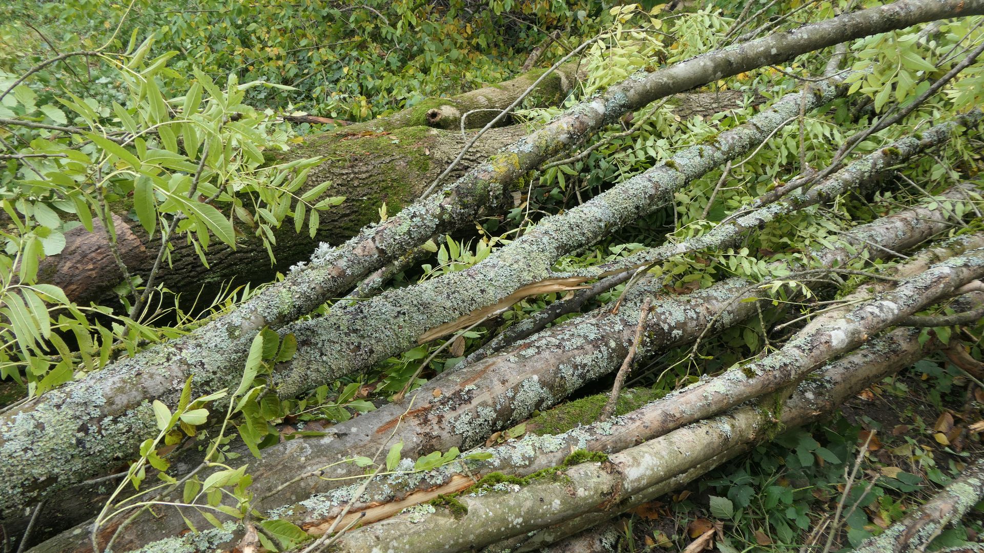 An einer im Sturm umgestürzten Esche in Kronenhöhe sind die Hauptäste flächig mit Blattflechten überzogen