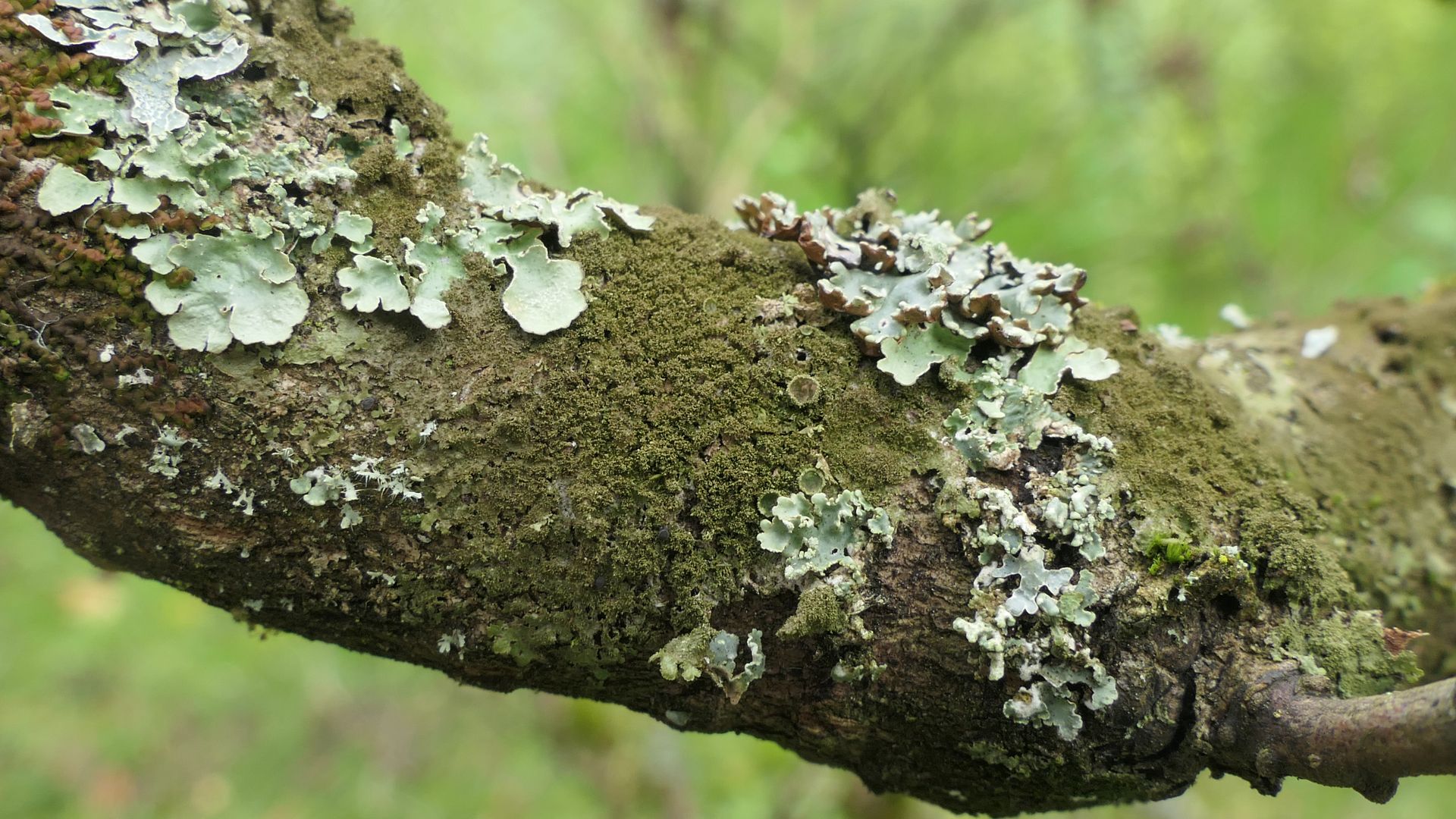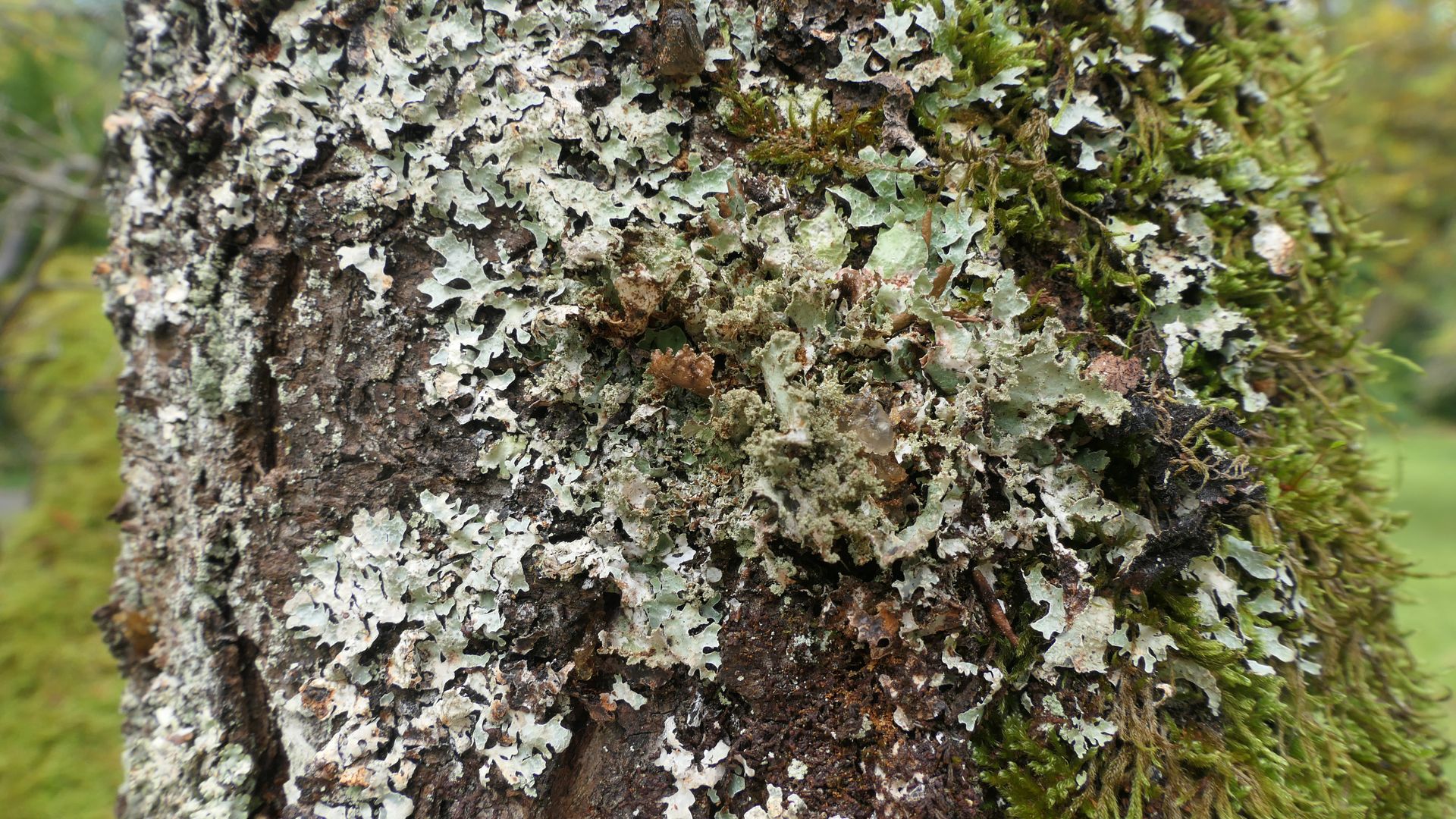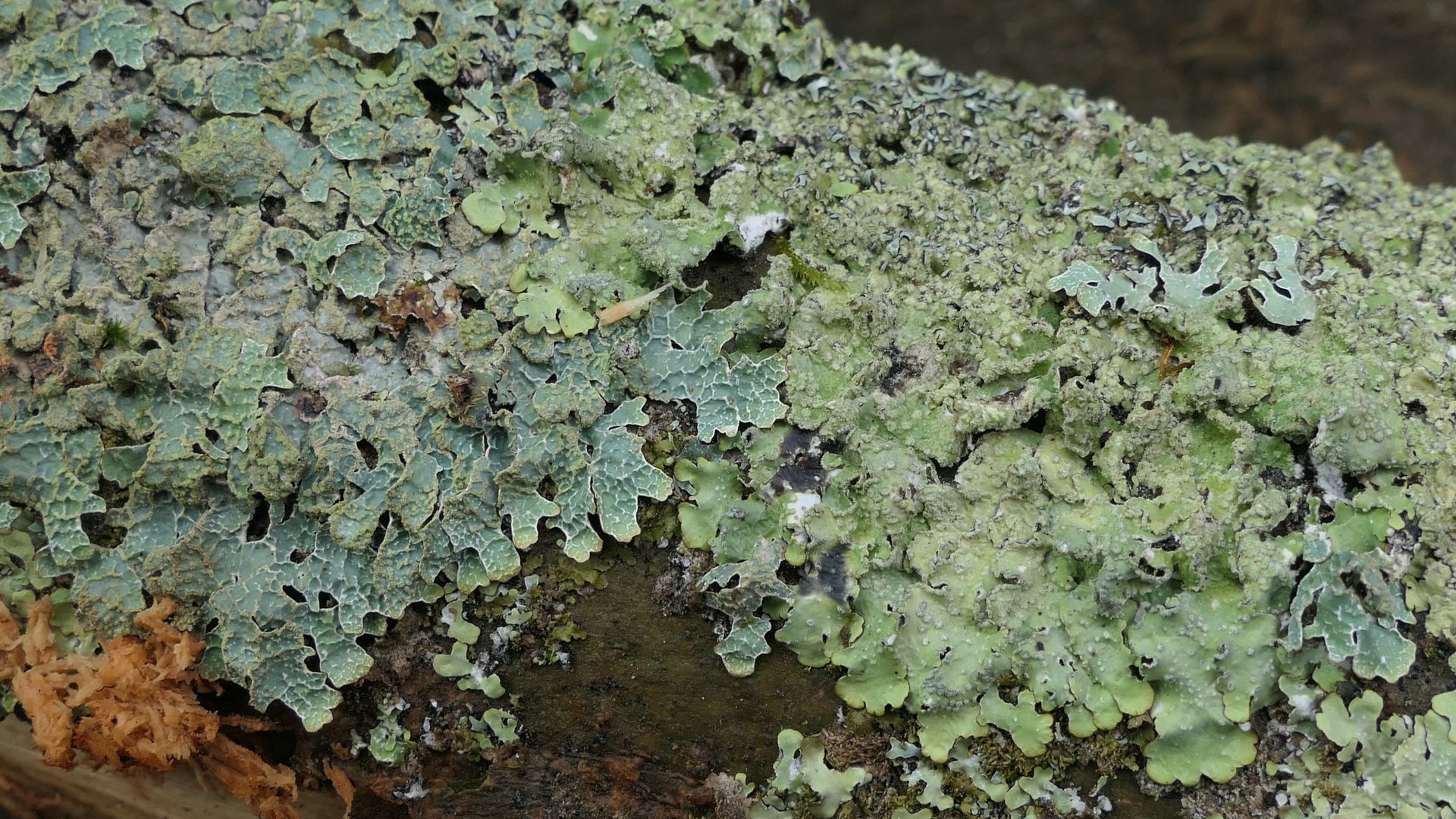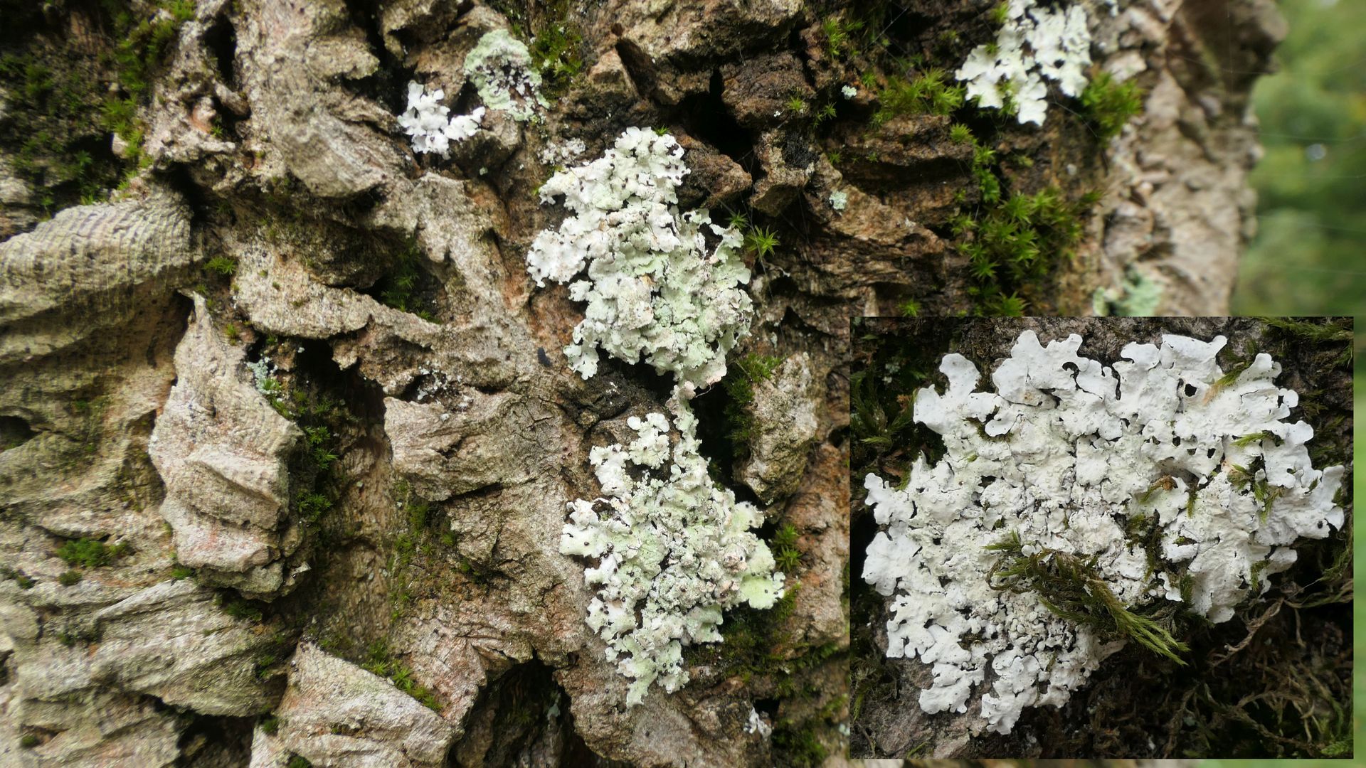 Bild 20 Rechts neben der bläulich grünen Parmelia sulcata eine im feuchten Zustand gelblich grüne Blattflechte mit vielen Punkt- aber auch Bortensoralen.