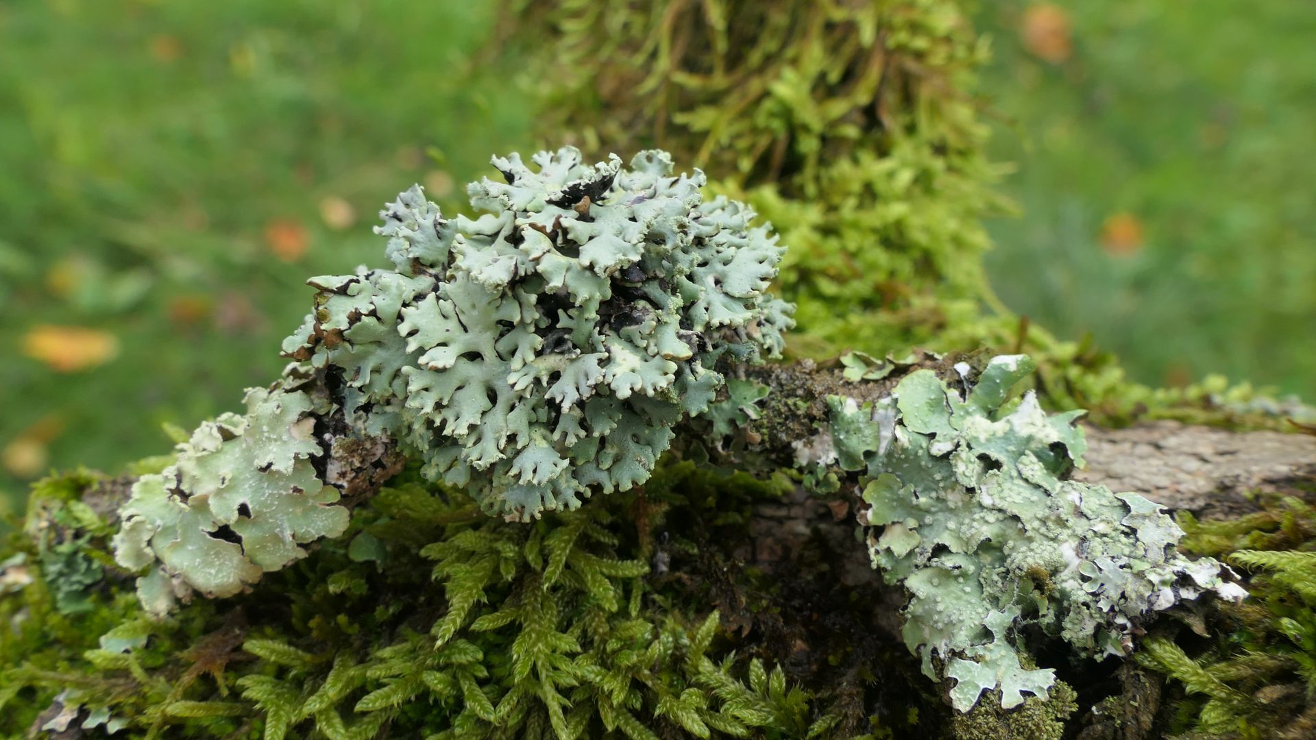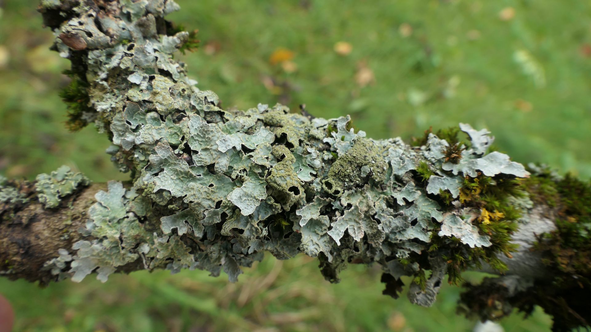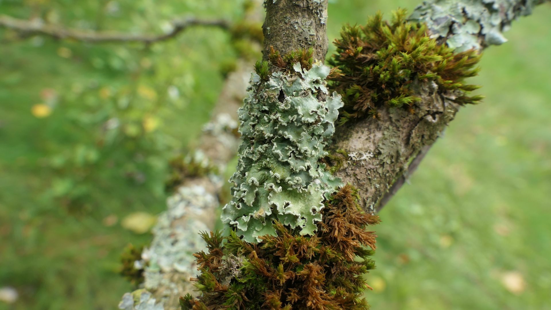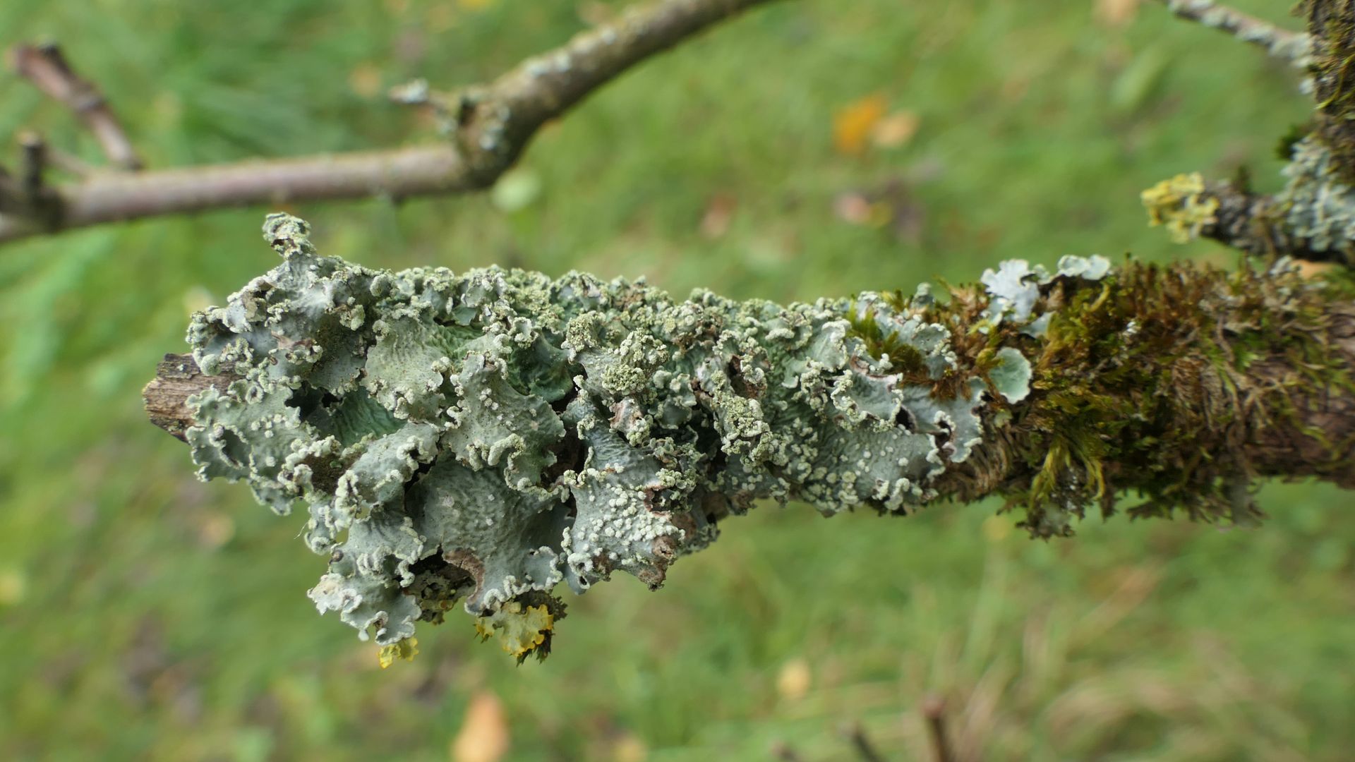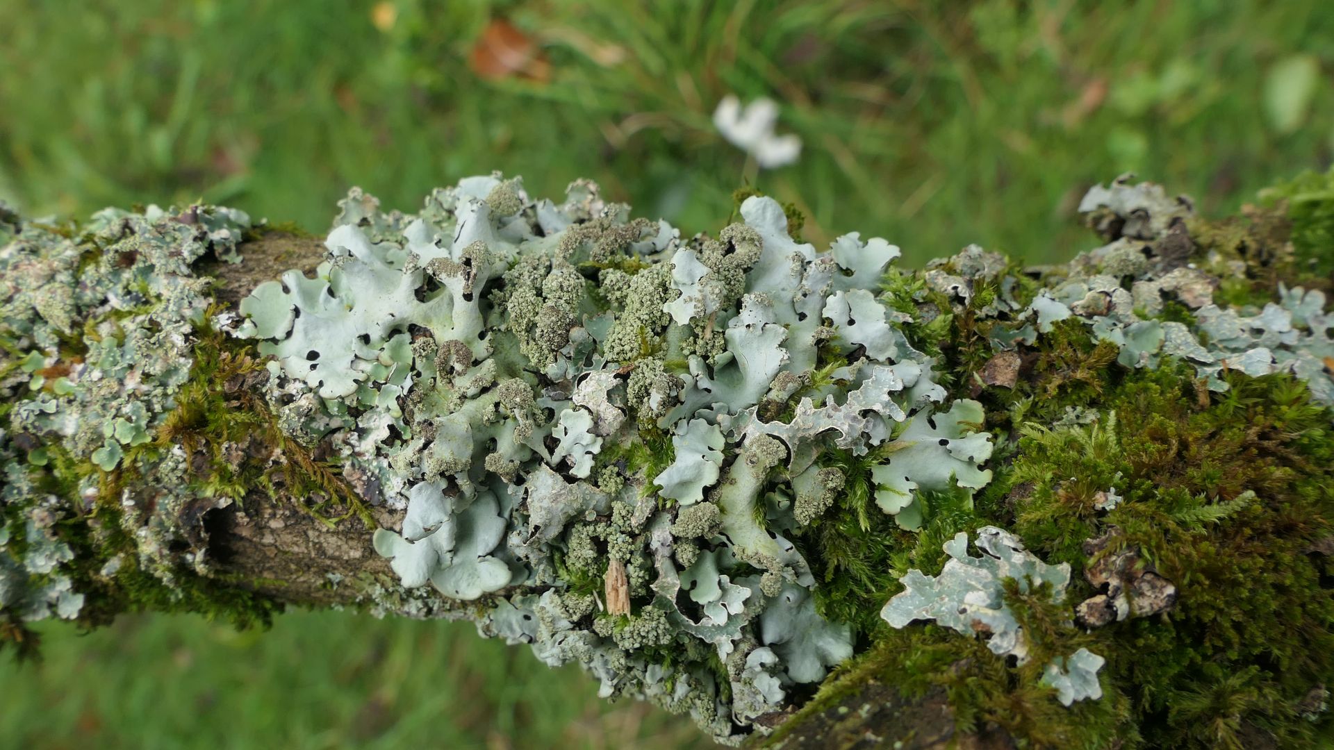 Bild 20 Rechts neben der bläulich grünen Parmelia sulcata eine im feuchten Zustand gelblich grüne Blattflechte mit vielen Punkt- aber auch Bortensoralen.