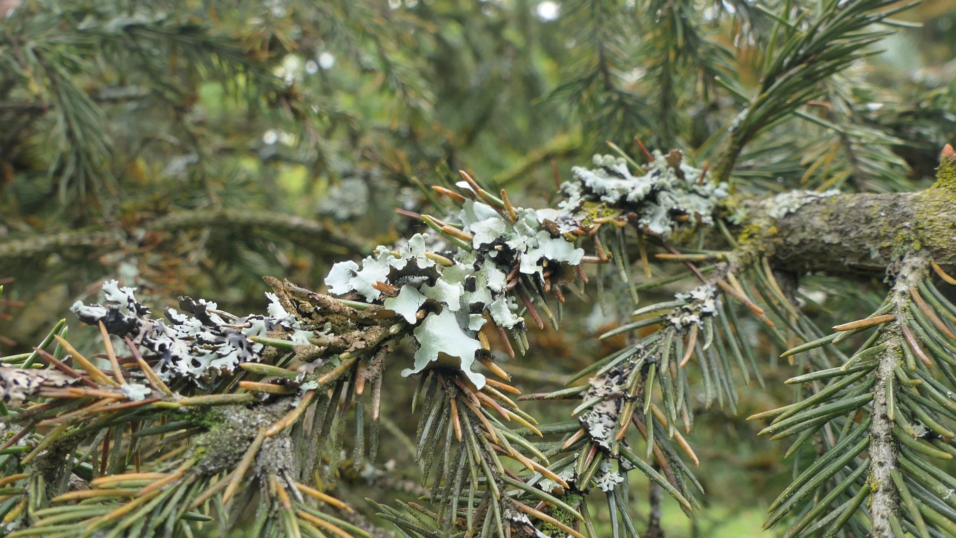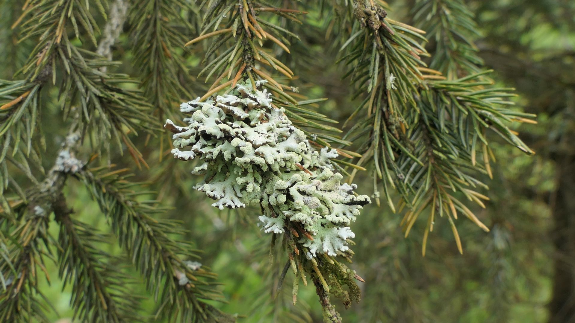 Die Äste und Nadeln der Fichte sind für die Gegend hier ungewöhnlich stark bewachsen: