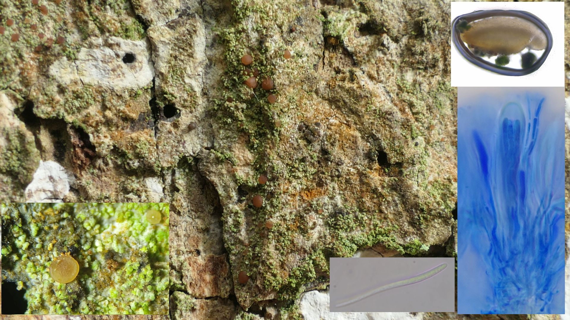 Bild 21 Krustenflechte Bacidia rubella mit körnigem Thallus und braun-orangen, alt randlosen Apothecien.