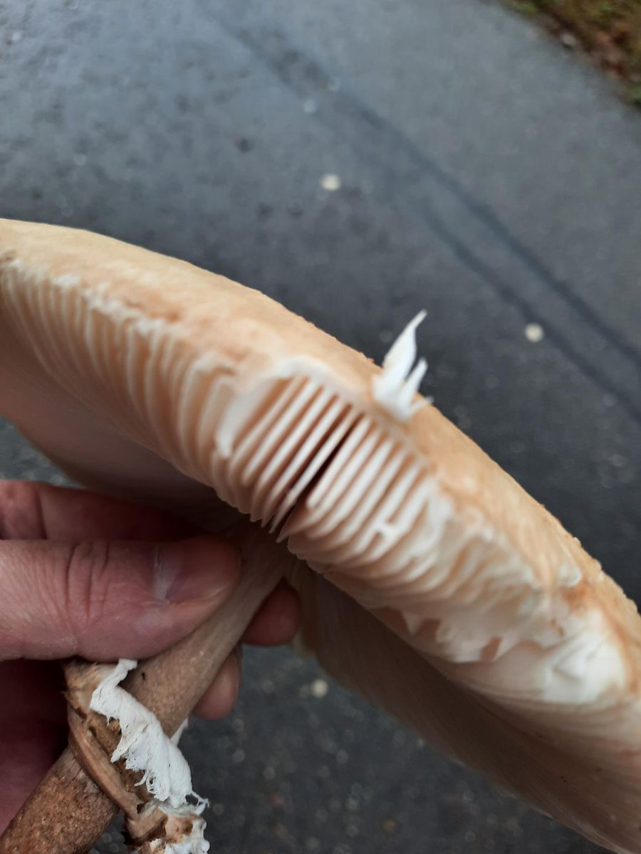 Stamm: ca. 15 mm Durchmesser, mittelbraun, unten die Oberfläche ein wenig wie Rinde. Nach leichterem Druck, splittert der Stamm längs, obwohl er sich beim Abschneiden des Pilzes recht stabil anfühlte.