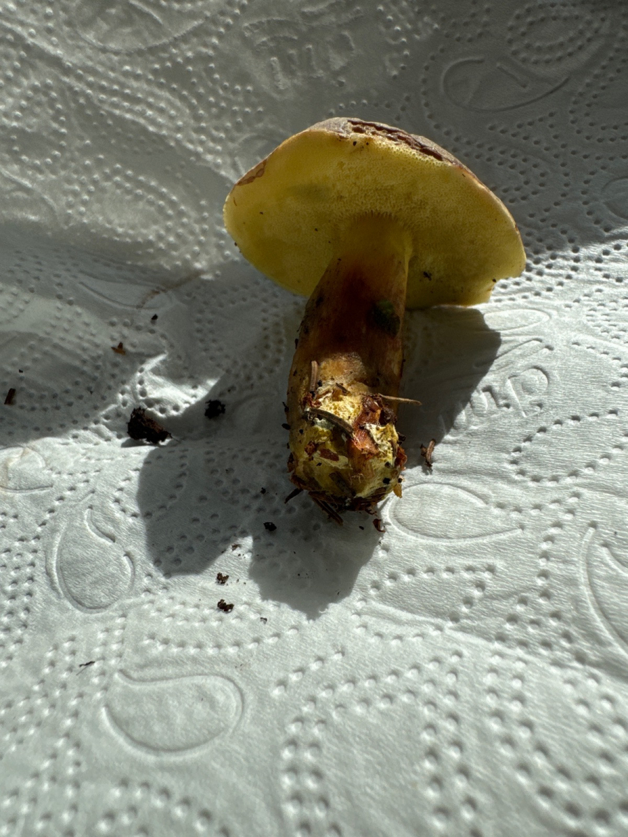 der sieht für mich auf den ersten Blick aus wie ein Flockenstieliger Hexenröhrling, wobei die Bilder 1. nicht die Röhren zeigen und 2. der Stiel etwas zu unscharf ist.