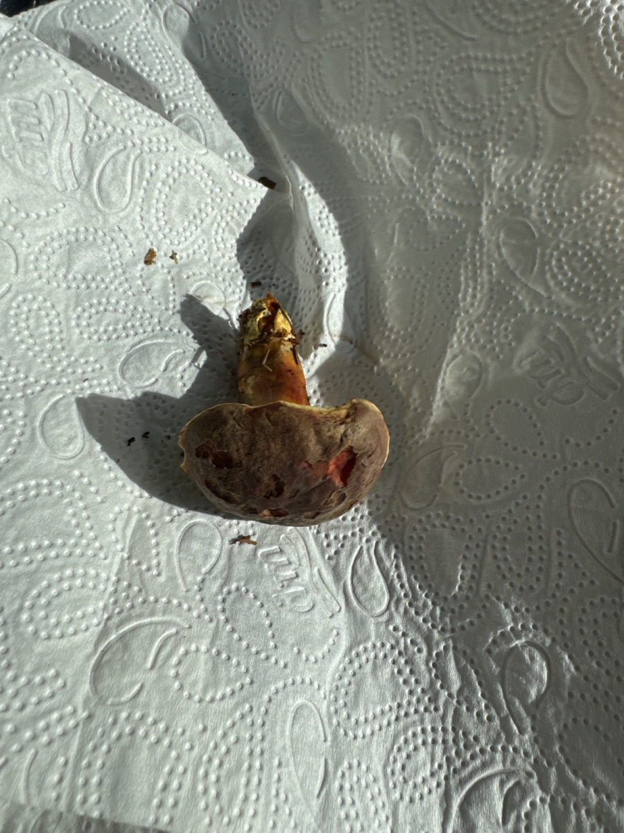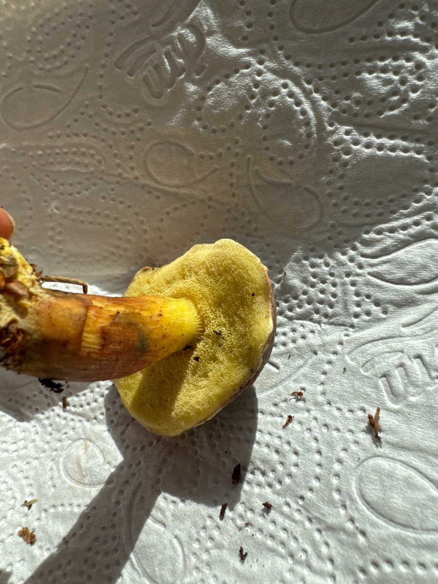 Wenn die Öffnungen der Röhren (wenn es überhaupt ein Röhrling ist) rötlich/ orange, die Röhren selbst gelb sind und der Stiel kein Netz hat, aber so rötliche "Sprenkler" hat und der Pilz im Anschnitt blaut, dann sollte es der o.g. Flockenstielige Hexenröhrling sein. Habitus und Hutfarbe passen da ganz gut.