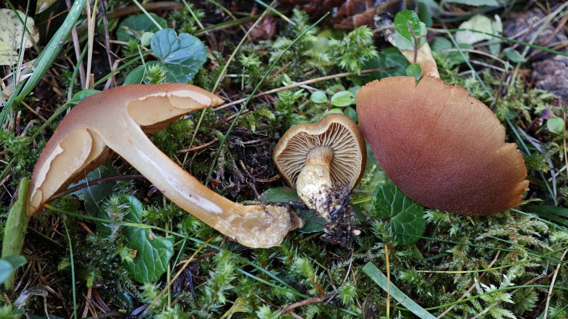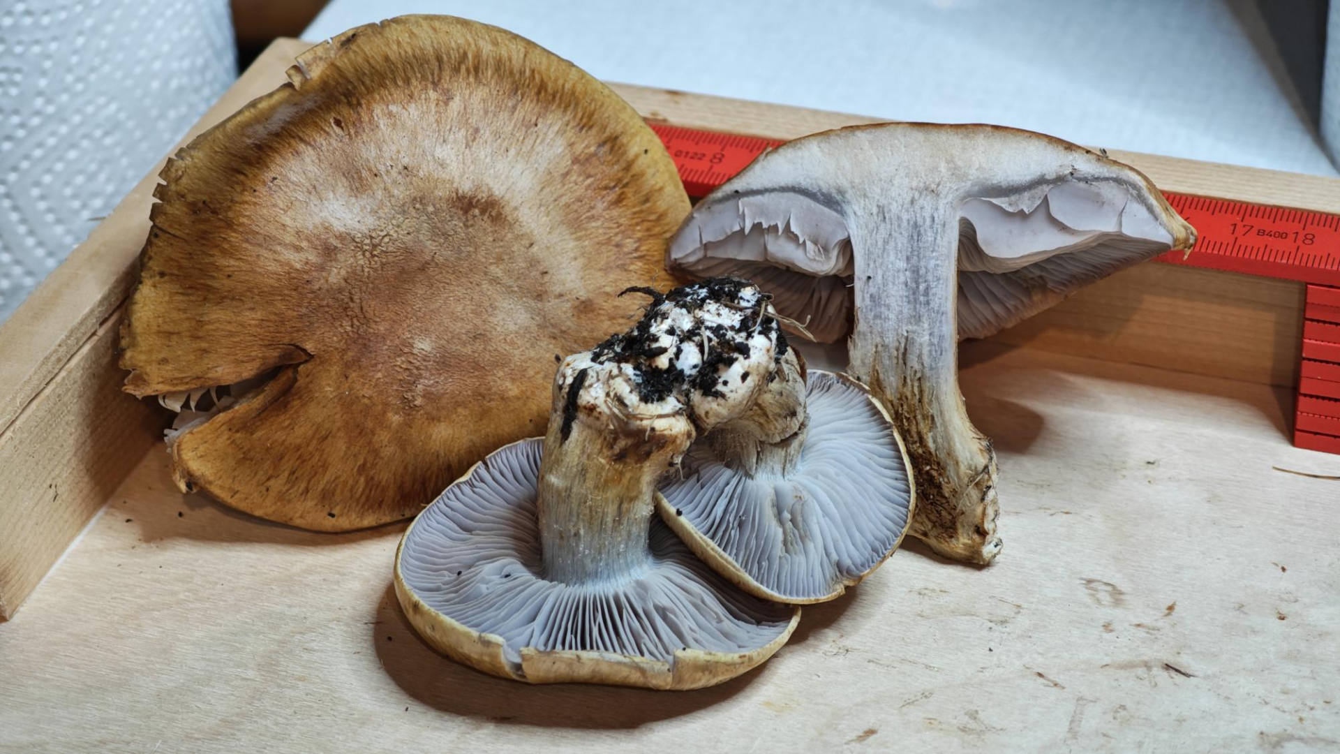 6. Als nächstes gabs zwei Schleierlinge. Beim ersten dachte ich an Cortinarius venetus var. montanus - Grüner (Nadelwald-) Raukopf. Wird diese Varietät überhaupt noch genutzt oder wäre das auch einfach Cortinarius venetus? Die Pilze hatten einen oliven Farbton in der Farbe, was man auf dem ersten Foto von draussen leider nicht gut sieht. Bei den Studioaufnahmen ist es besser zu sehen. Auch das wäre für mich ein Erstfund, daher auch hier noch die Frage, ob ihr mit der Bestimmung einverstanden seid. Die Sporengrösse und Form dürften passen. Bei Bedarf kann ich auch noch Fotos nachreichen: