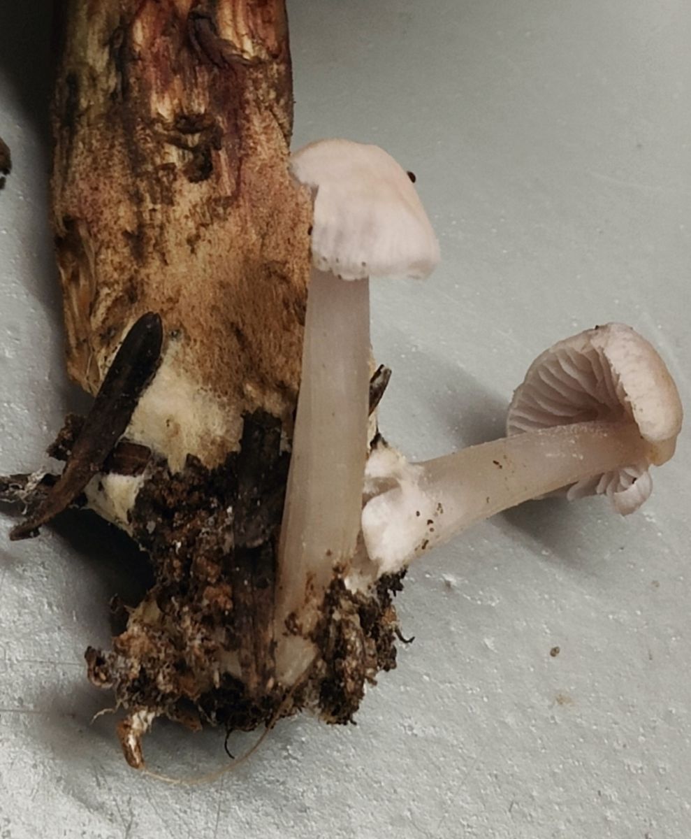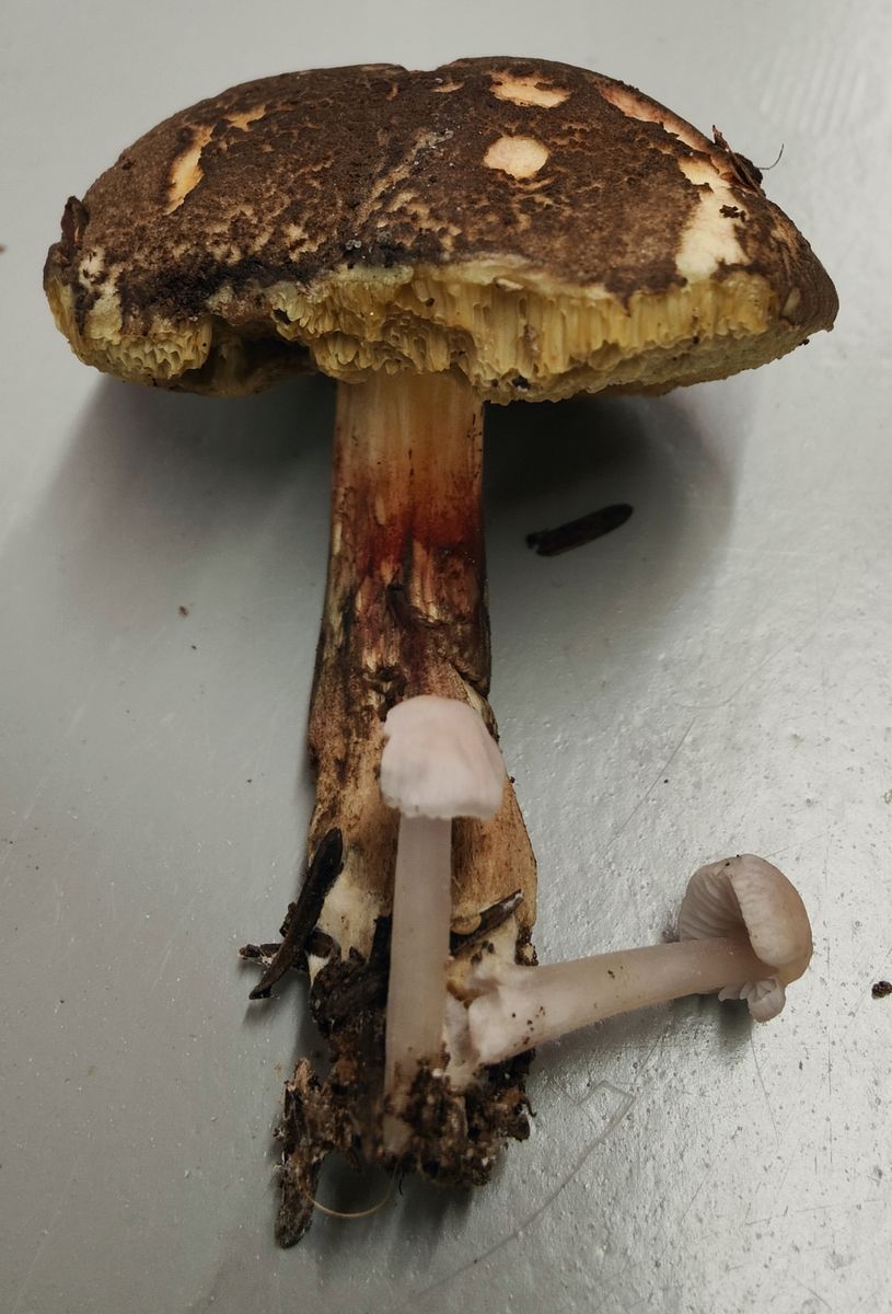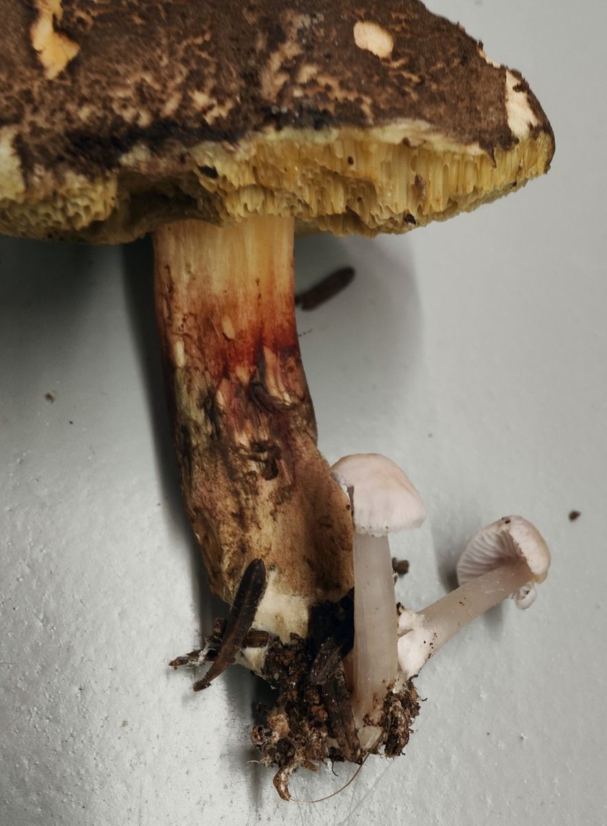 Heute staunte ich nicht schlecht bei einer Korb-Kontrolle. Ein X. chrysenteron und an der Basis zwei kleine Blätterpilze ; ich vermute Mycena rosea....