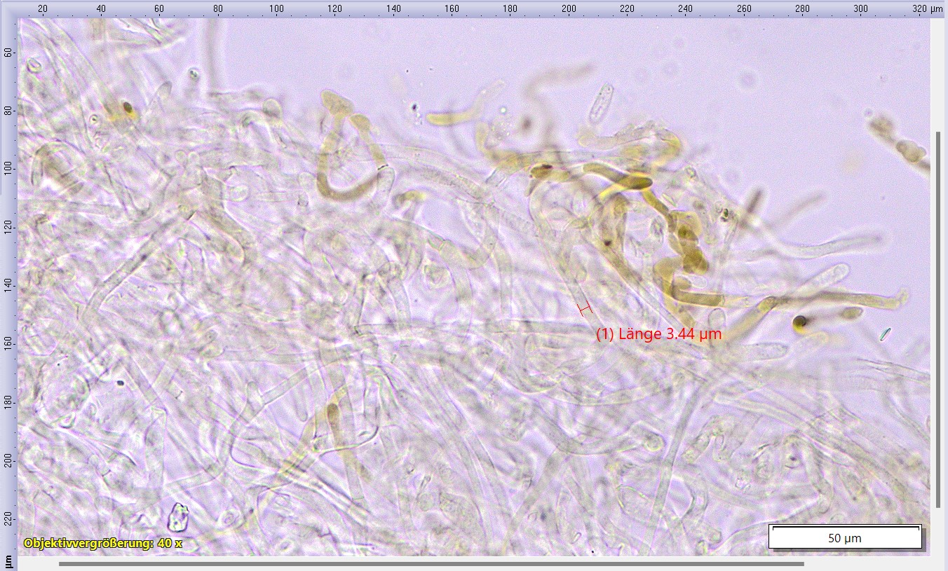 leicht inkrustiert, Hyphen mit braunem Inhalt gefärbt.