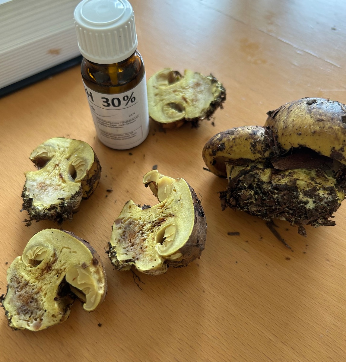 Nee, wieder einmal bekomme ich gezeigt, dass ich in dieser Hinsicht nix geregelt bekomme. Der markante Geruch (im Anschnitt wahrnehmbar, wie eine Mischung aus Salmiak und Pfeffer einerseits und einer leicht süßlich-honigartigen, kaum wahrnehmbaren Komponente anderseits) und die fehlende Farbreaktion mit NaOH (Huthaut, Stielknolle, Stielspitze - nirgendwo eine Farbreaktion mit NaOH) hinterlassen nur Fragezeichen.